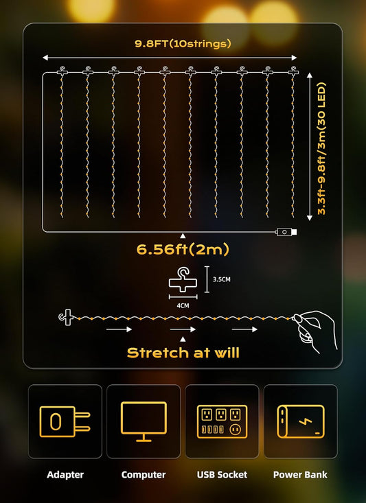 HXWEIYE 300LED Fairy Curtain Lights, 9.8x9.8Ft Warm White USB Plug in 8 Modes Christmas String Hanging Lights with Remote for Bedroom, Indoor, Outdoor, Weddings, Party
