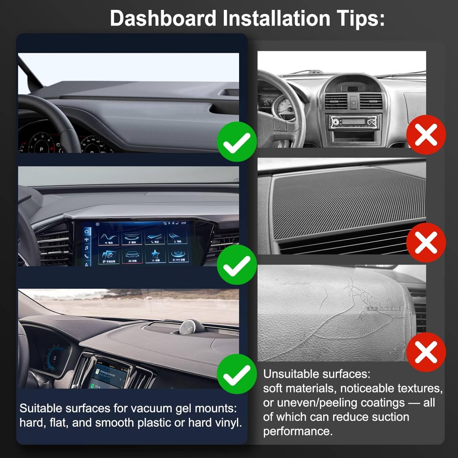 - Vacuum Lock + Gel Base — For Smooth, Flat Surfaces: Features a rotary vacuum-lock and 4-layer washable gel base that forms a rock-solid hold on flat, non-textured surfaces such as glass, glossy dashboards, or hard leather. Avoid use on curved, soft, or textured materials. To install, firmly press the gel base and rotate the vacuum lock clockwise until tight