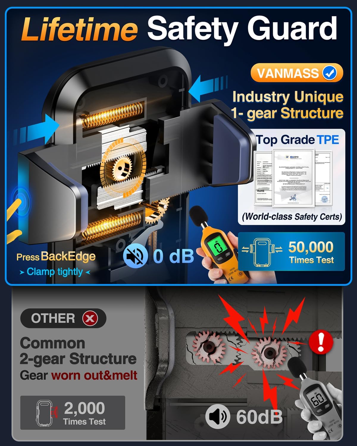- 𝐁𝐄𝐒𝐓 𝐂𝐡𝐨𝐢𝐜𝐞: 𝐇𝐢𝐠𝐡-𝐄𝐧𝐝 𝐂𝐚𝐫 𝐌𝐨𝐮𝐧𝐭 𝐓𝐫𝐮𝐬𝐭𝐞𝐝 𝐛𝐲 𝟗,𝟓𝟎𝟎,𝟎𝟎𝟎+𝐔𝐬𝐞𝐫𝐬 𝐨𝐯𝐞𝐫 𝟏𝟎 𝐘𝐞𝐚𝐫𝐬 2025 VANMASS car phone holder is certified by all authoritie5 (International Military-Grade Shockproof Cert No. GZMR230200285101, CP65, REACH, RoHS), based on Unique Grandmaster Design (EUIPO Patent No.006590790-0003), TOP Durable & Healthy Materials from 20,900 materials & Industry-Leading Safety Tests (Monthly 5,000+ open/close test; 100,000+km rugged road tests).
