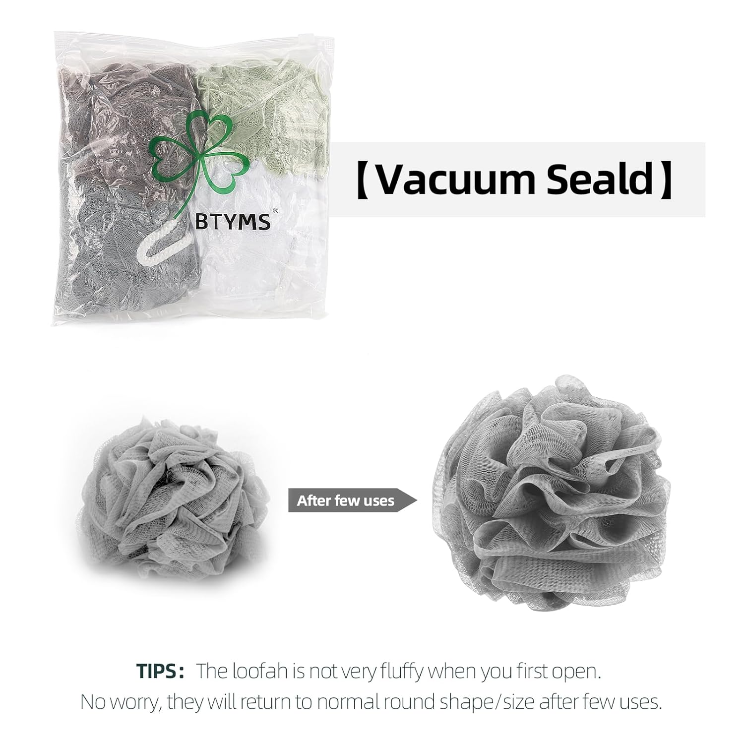 - Vacuum Seald: The loofah is not very fluffy when you first open. No worry, they will back up to normal round shape/size after few uses