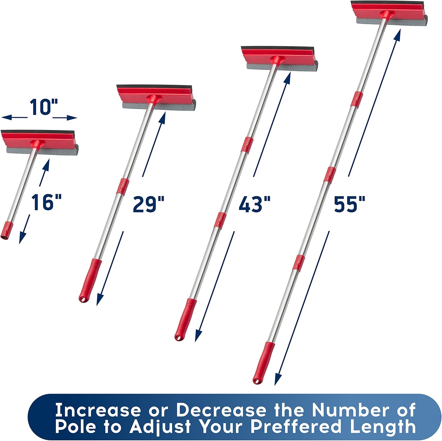 - EASY TO USE 2 in 1 Function Window Cleaning Tool With 4 Section Of Extension Poles, You Can Adjust Length According to Your Needs (FROM 16'' TO 55''). Our Telescopic Window Squeegee for Window Cleaning Includes Two Parts: Rubber Strip and High-Quality Sponge (10 inches). It is Convenient to Use the Sponge Scrubber to Clean Windows, the Rubber Squeegee to Wipe Water. This All-in-One Set is All You Ever Need to Quickly and Efficiently Clean Windows, Shower Doors and Any Other Smooth Surface.