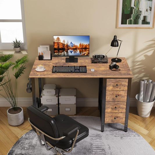 Lufeiya 40 inch Computer Desk with 4 Fabric Drawers, Kids Student Reversible Small Desks for Home Office Small Space, Work PC Desk Table for Bedroom, Rustic Brown