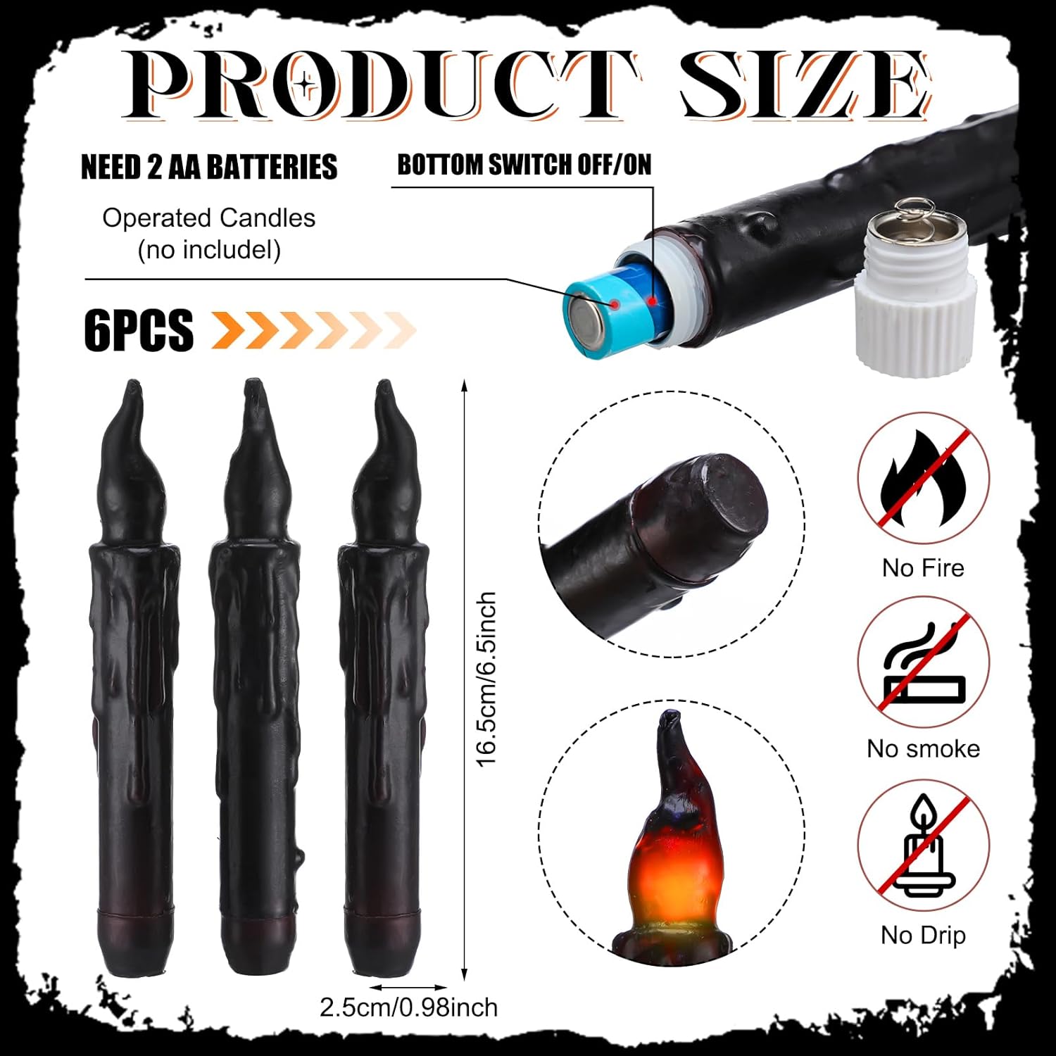 - Halloween Candles Set: come with 6 pcs black flameless taper candle set, each candle measures 6.5 x 0.98 inch and requires 2 AA batteries (not included), tighten or loose the cap on bottom of the battery-operated candles for ON/OFF; Remote control not included