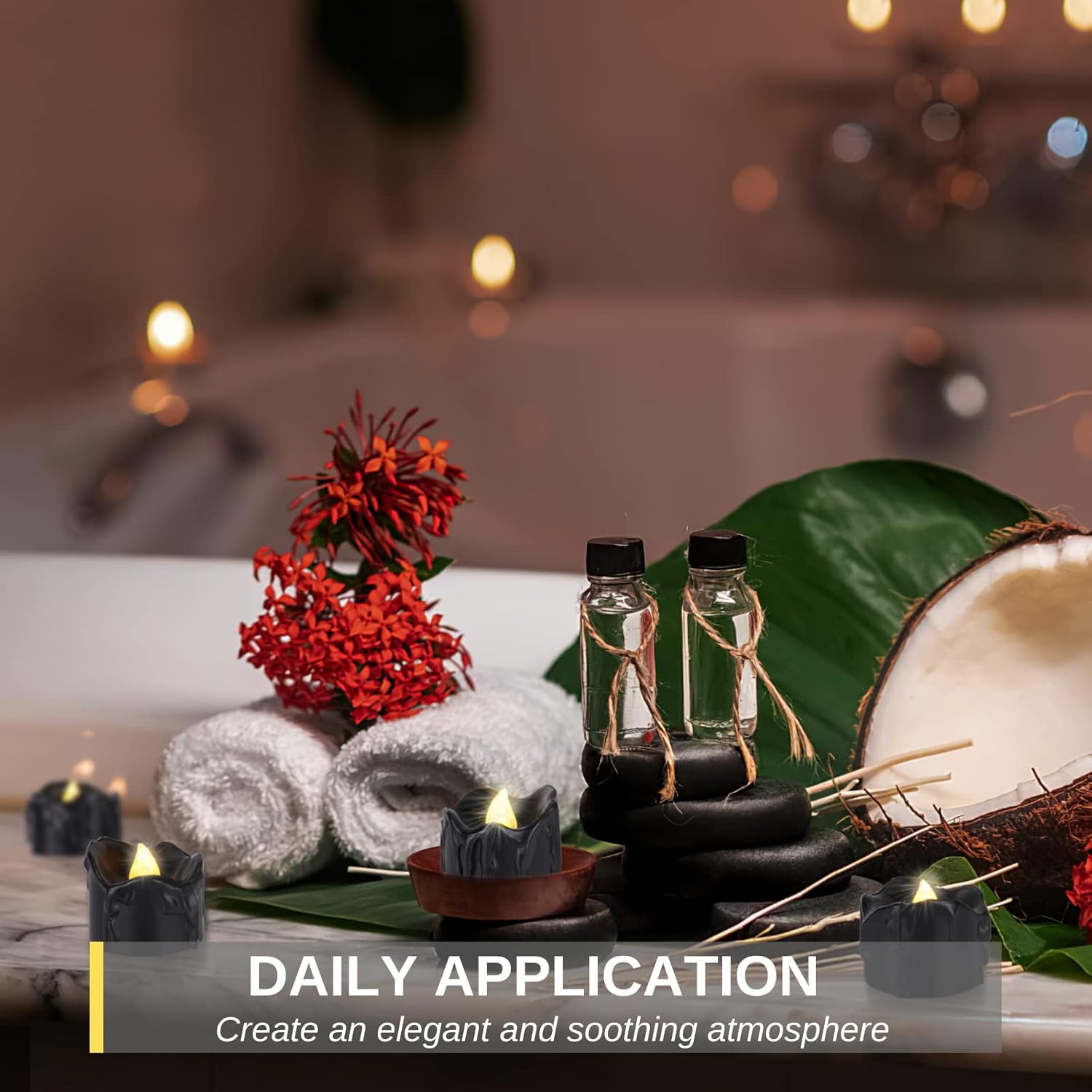 - KEY SPECS — Black Dripping Body with Melted Look, Warm White Flicker; 1.58" Dia × 1.2" H; Pre-installed High-Capacity Battery; No Timer, No Remote