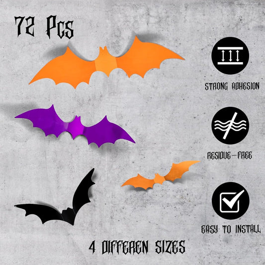 LOLStar 72PCS Halloween Bats Decoration, 4 Different Sizes Realistic PVC Black Purple and Orange 3D Bat Stickers for Summerween Home Decor DIY Wall Decal Indoor, Outdoor Halloween Party Supplies