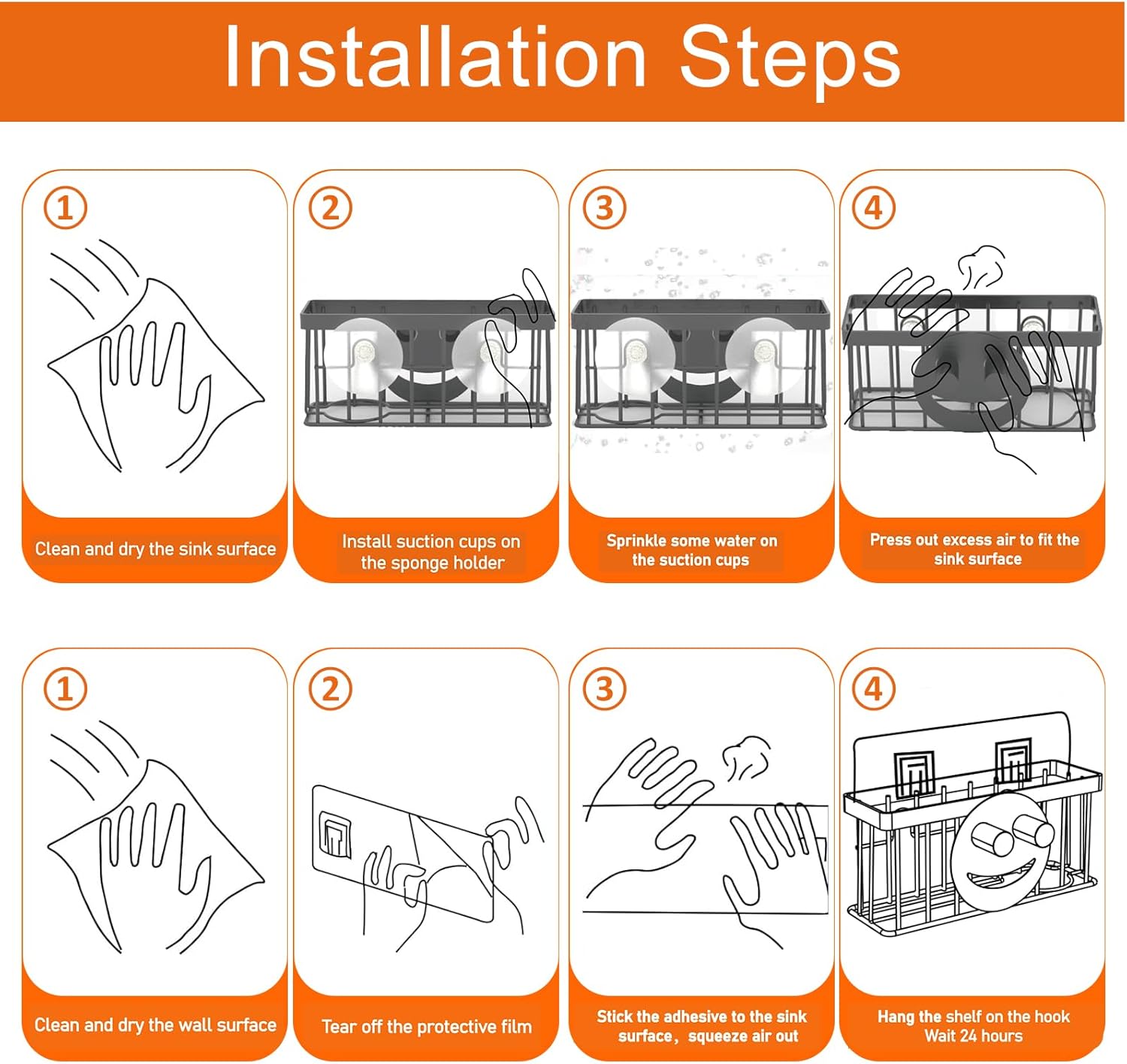 - TWO DIFFERENT INSTALL METHODS: Our sponge caddy comes with 1 suction cup and 1 adhesive strip. Choose the method of installation based on your requirements. Applicable for kitchen walls (smooth and neat), can also be applicable for in sink, smooth tiles/marble tiles/glass/metal walls and, etc