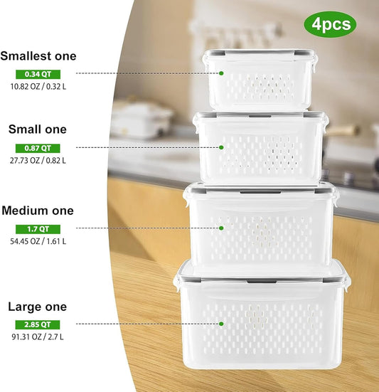 Freshmage Fruit Storage Containers for Fridge with Removable Colander, Airtight Food Storage Container, Dishwasher Safe Produce Saver Container for Refrigerator, Keep Berry Fruit Fresh 4 pcs Small