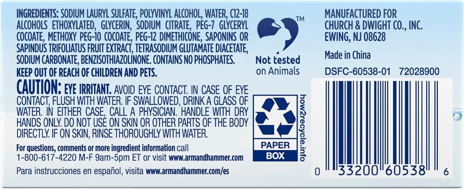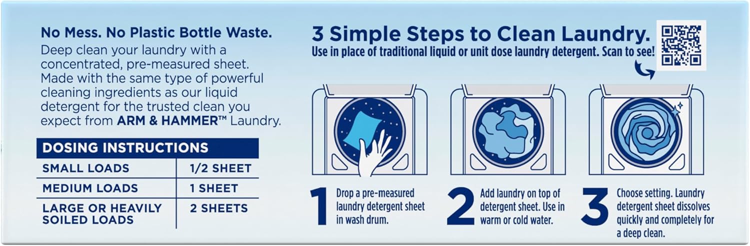 Get the clean you trust with ARM & HAMMER Power Sheets—now in a fragrance-free, dye-free formula that's perfect for sensitive skin and eco-conscious households. These lightweight, pre-measured detergent sheets deliver a powerful clean without the mess, waste, or harsh chemicals.
