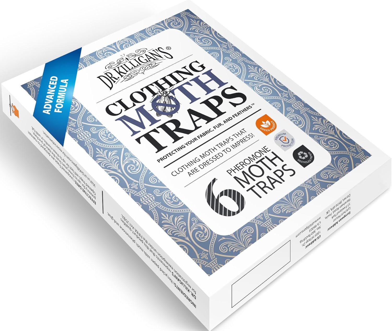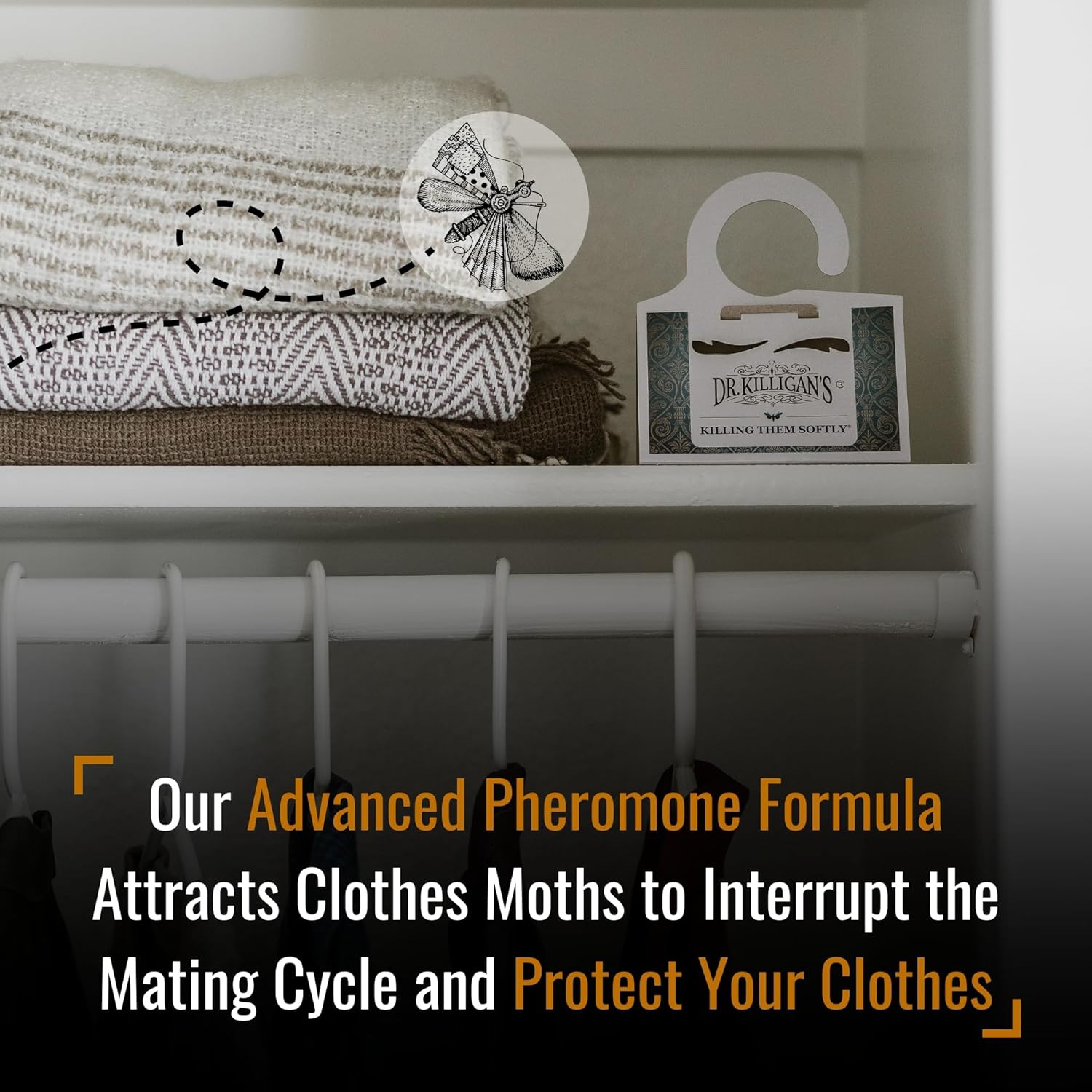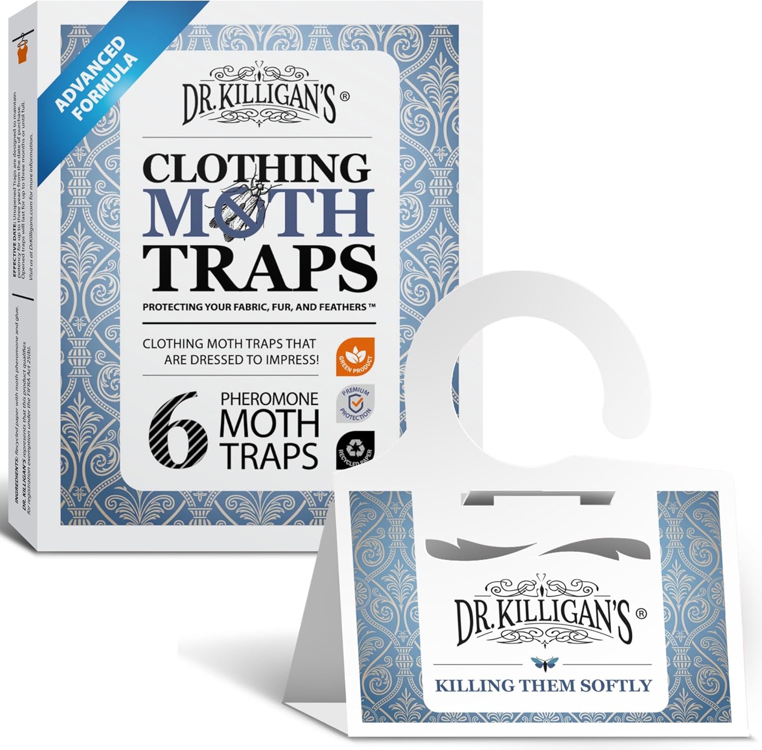- Organic Solution with Killer Results — Get closet moth protection for your Wool, Cashmere, Fur, Feathers, Carpet and more with Dr. Killigan’s people and pet-friendly moth traps. Our Advanced Formula mixes double-potent pheromones and the stickiest glue to lure and capture ALL adult male clothes moths and end the reproduction cycle. The complementary design maximizes air flow and increases effectiveness.