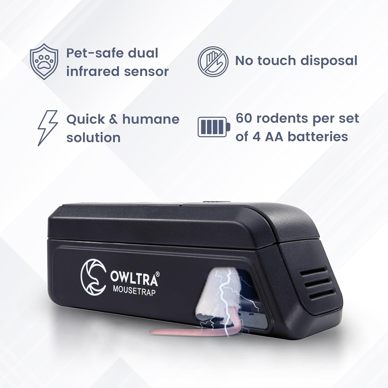 - The Humane Solution: Owltra is the humane solution for getting rid of rodents. A set of 4AA batteries exterminate 60 rats; Infrared sensor & no escape design keep rodent in place and generate 6,000 to 9,000 high voltage shock for quick elimination.