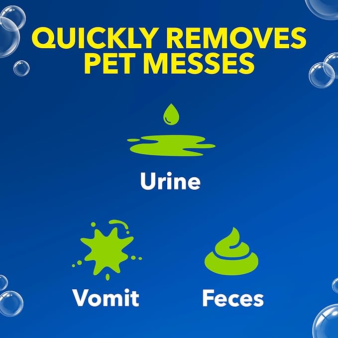 - This cleaning solution and rug cleaner in a convenient spray bottle quickly removes pet mess stains like urine, feces and vomit