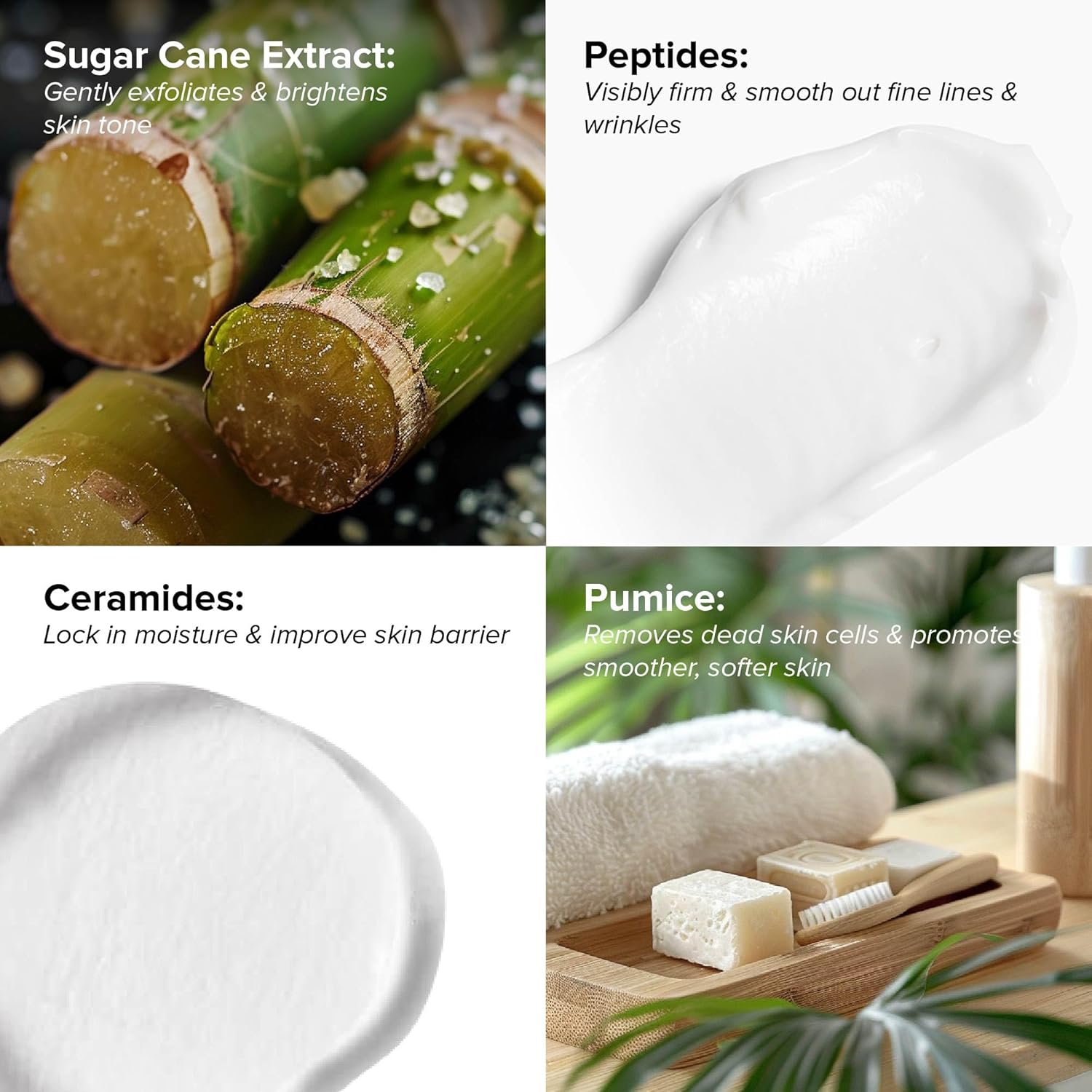 - All natural ingredients including sugar cane extract (glycolic acid), green tea leaf extract, lemon fruit extract, and apple fruit extract. Parabens, sulfates and cruelty free.