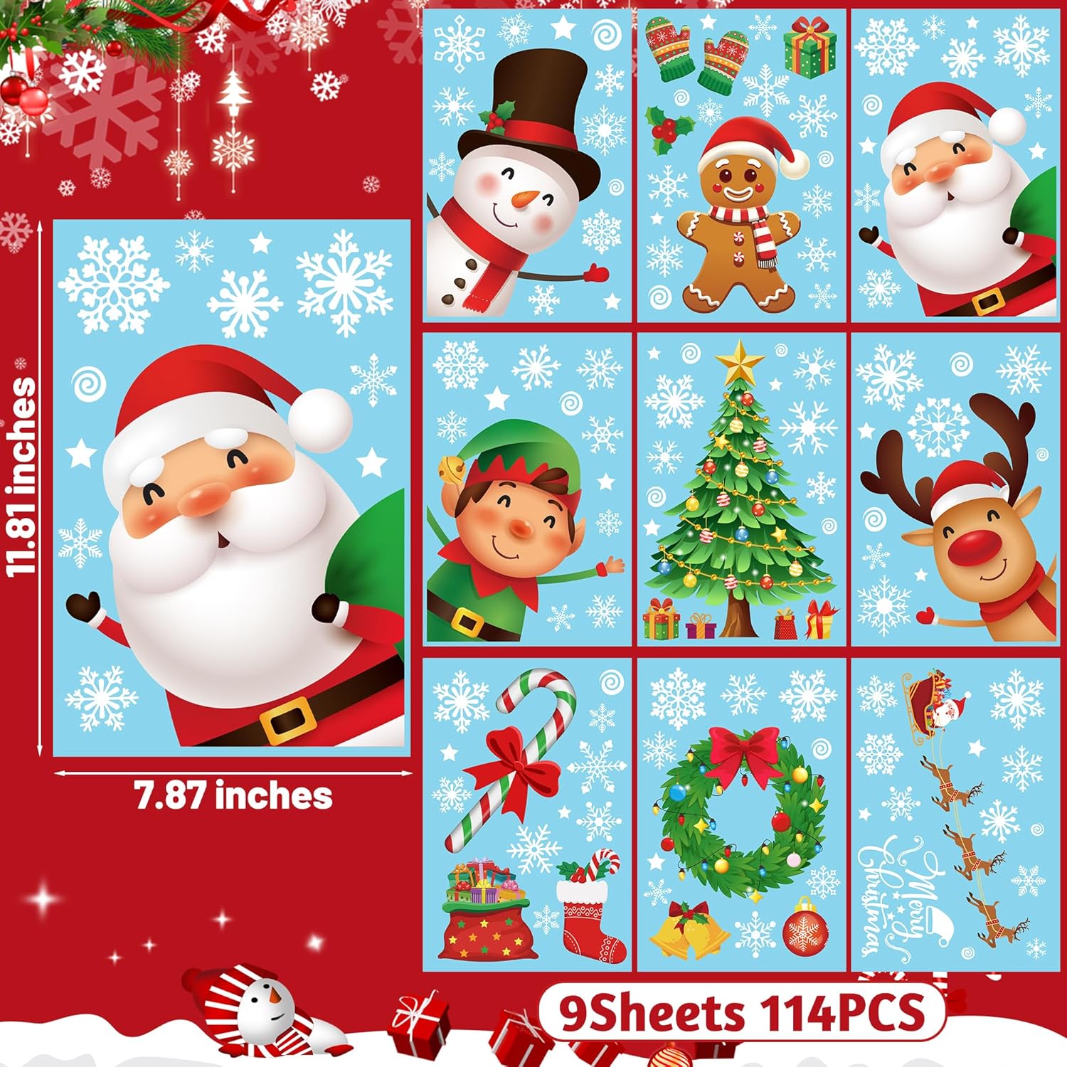 - Package Includes: This Christmas decoration set comes with 9 sheets of festive window clings, featuring delightful designs including Santa Claus, elves, snowmen, Christmas trees, and snowflakes—totaling 144 individual pieces. Each sheet measures 7.87" x 11.81", providing plenty of options to create a magical holiday display.