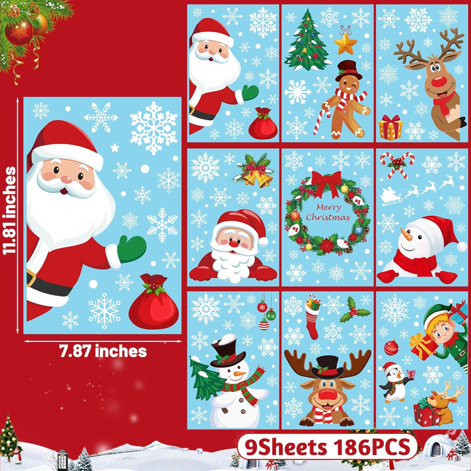 - Packing Includes: This Christmas decorations set features 9 sheets of Christmas window clings for glass, including 1 sheet each of Santa Claus, elf, snowman, tree, and snow designs—totaling 186 pieces. Each sheet measures 7.87" x 11.81".
