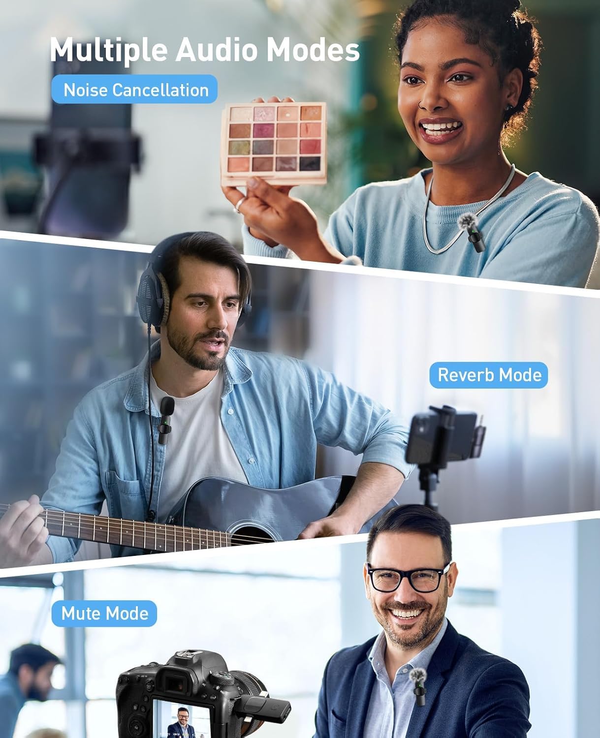 - Multi-Mode Switching: The design of the texture black wireless mic is equipped with three smart modes: default noise canceling mode, mute mode activated by double clicking the Bluetooth microphone, and reverb mode by triple clicking, providing easy adjustments for various recording requirements