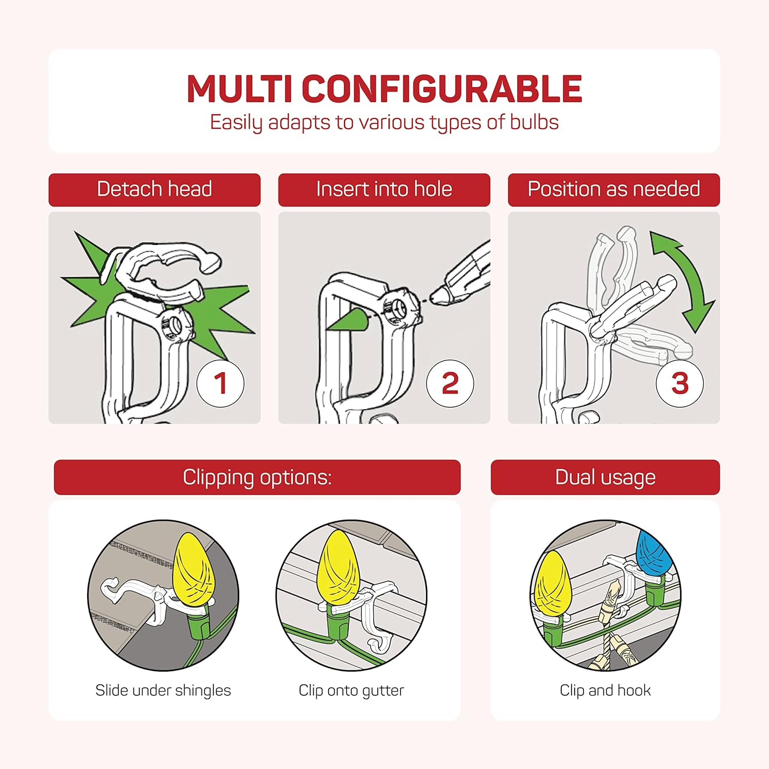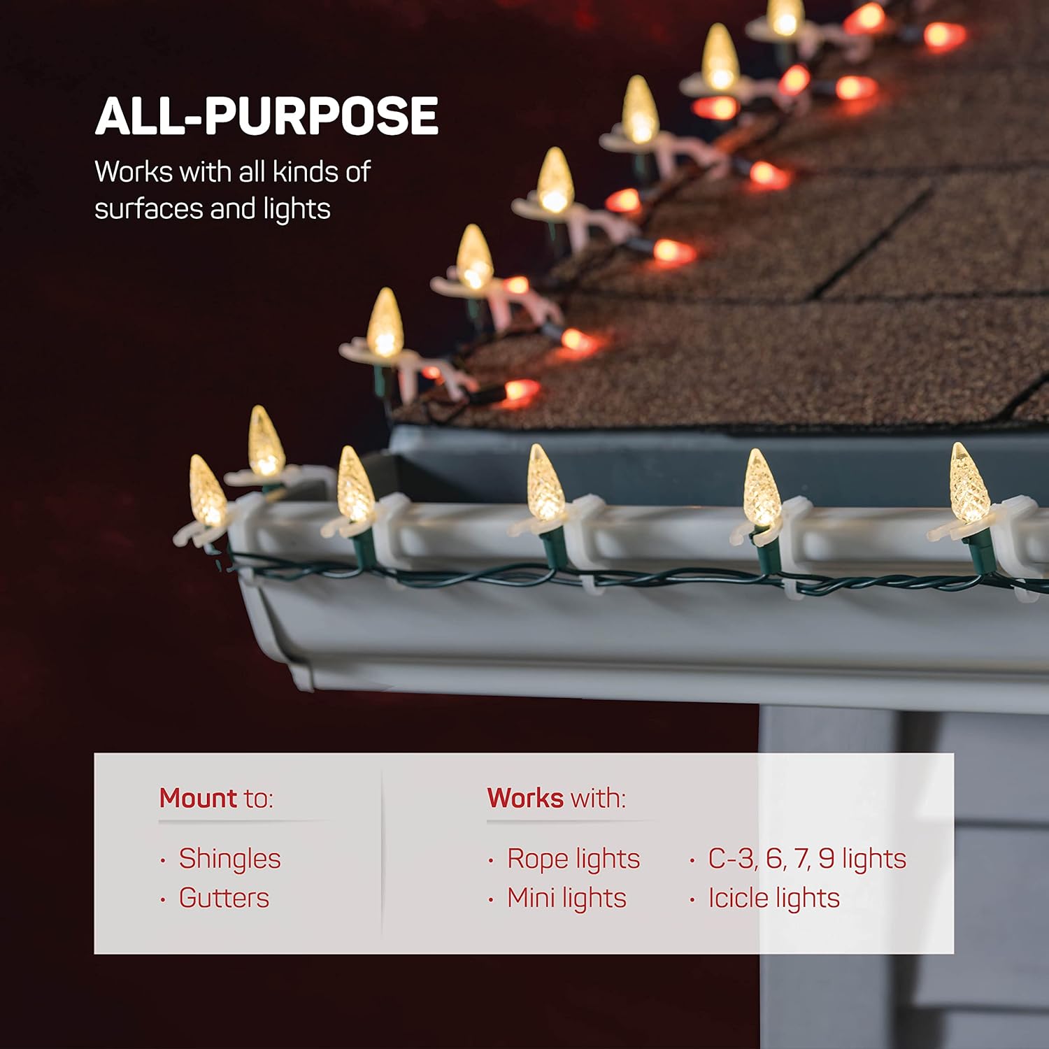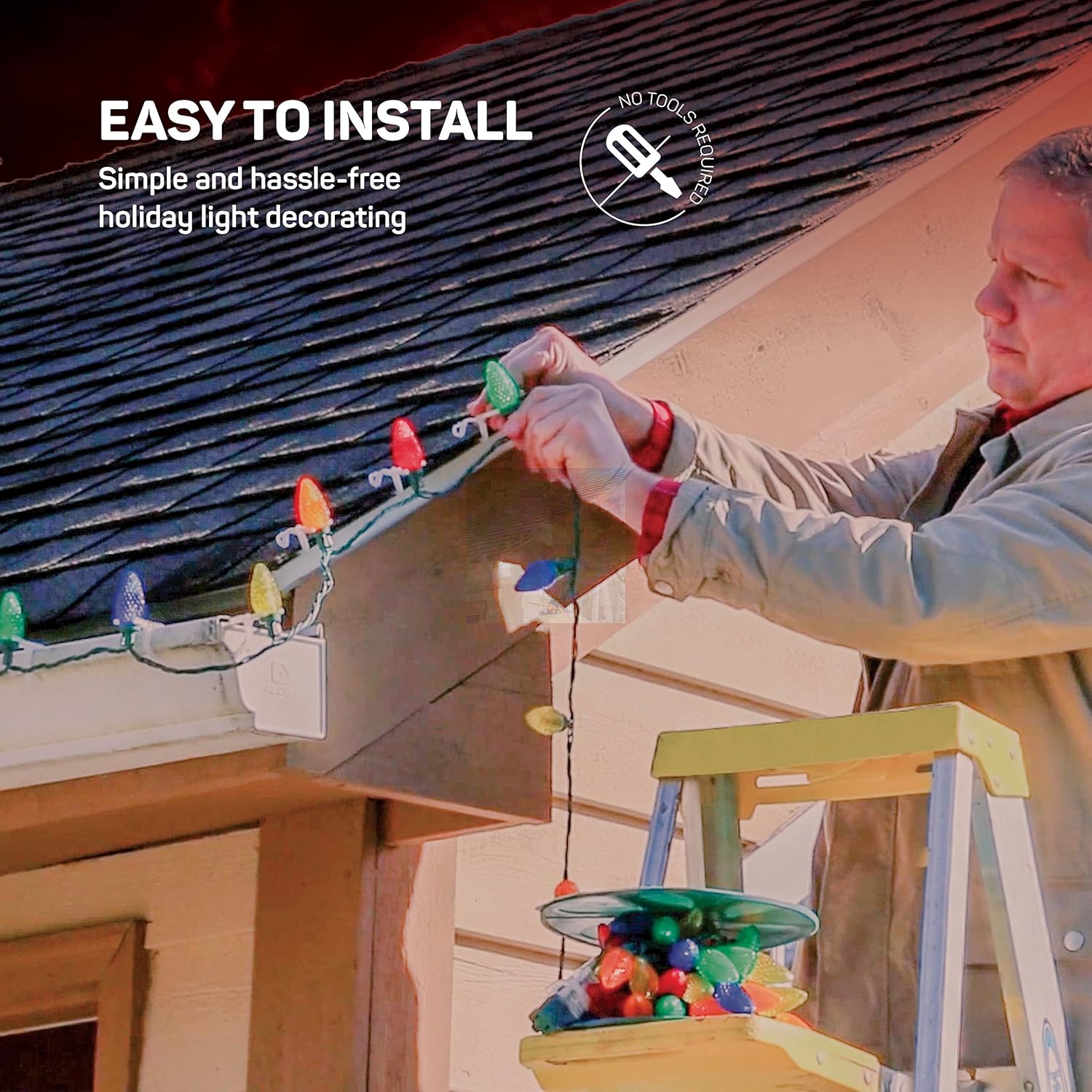 - EASY INSTALL: Christmas light clips can be used as-is or detached in 2 pieces to achieve the lighting position of your choosing; secure clips tightly to surfaces all season long without damage.