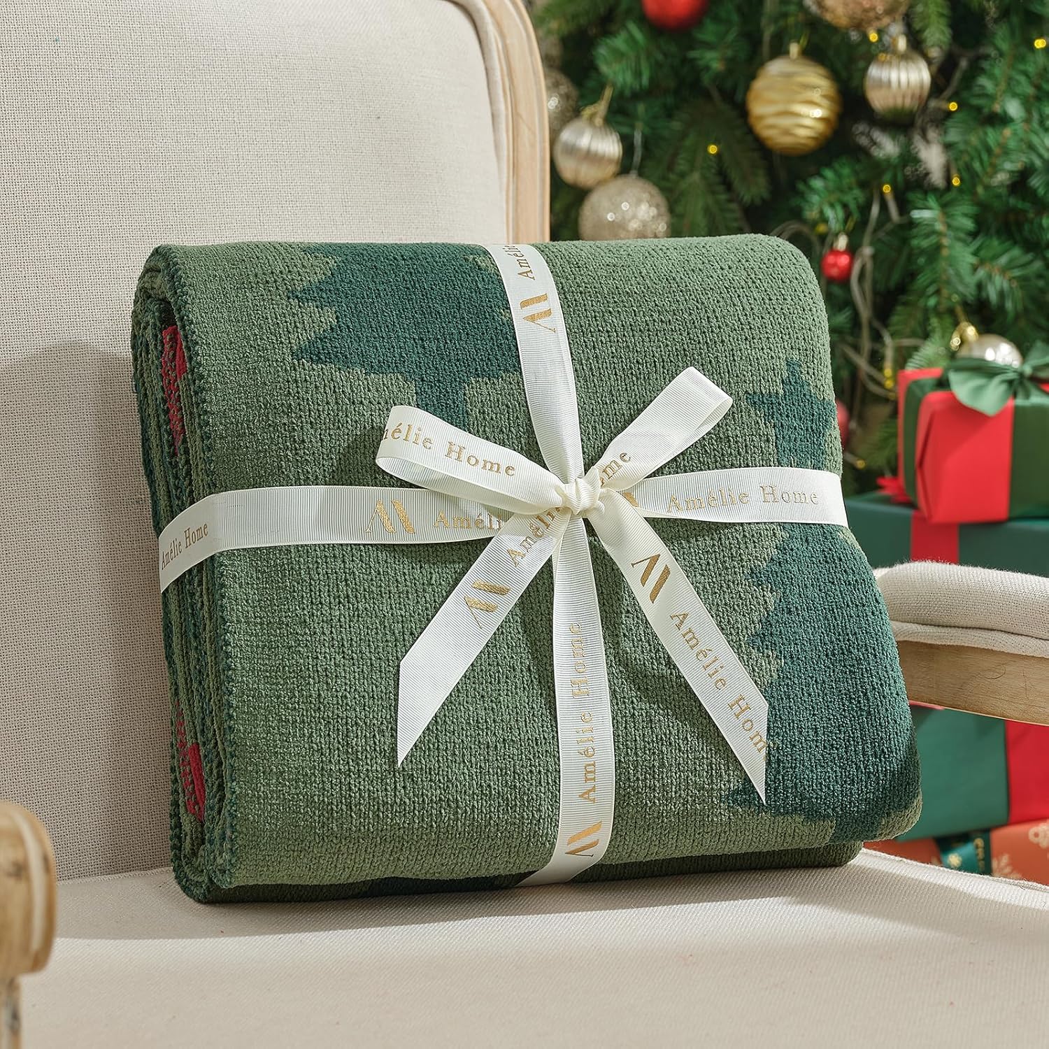 Amélie Home Christmas Throw Blanket for Couch, Reversible Pattern Christmas Tree Themed, Chenille Knit Xams Soft Cozy for Bed Home Decor Gift for Family, 50" x 60", Christmas Tree