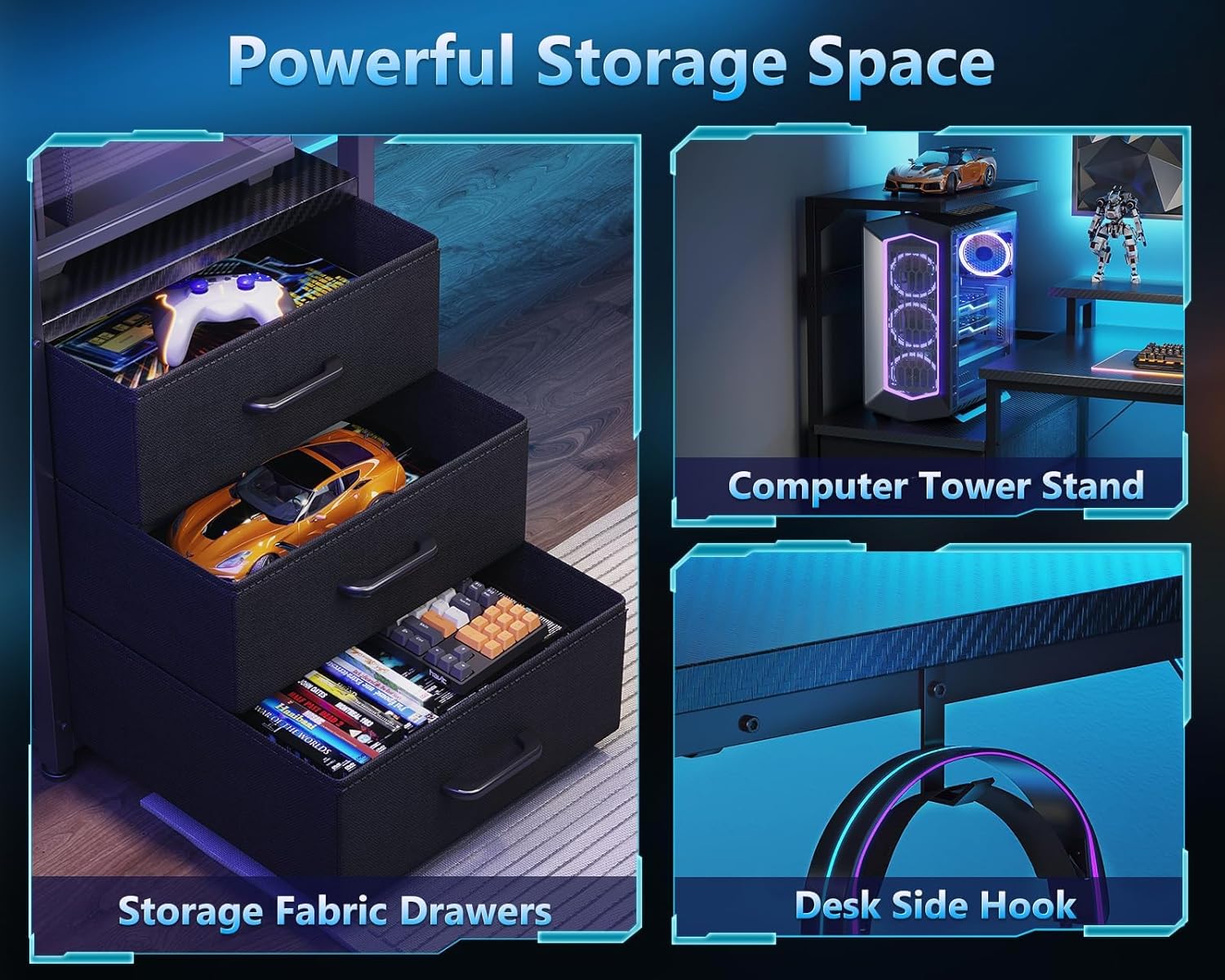 - Computer Desk with Powerful Storage Function Featuring 3 fabric drawers, a side hook and an open storage shelf that is large enough to hold your gaming PC, this computer desk allows for a large storage space to keep your gaming gear, Bluetooth stereo, headphone etc. organized and easily accessible. The reversible shelf design allows you to install the shelf on the left or right depending on your usage scenario.