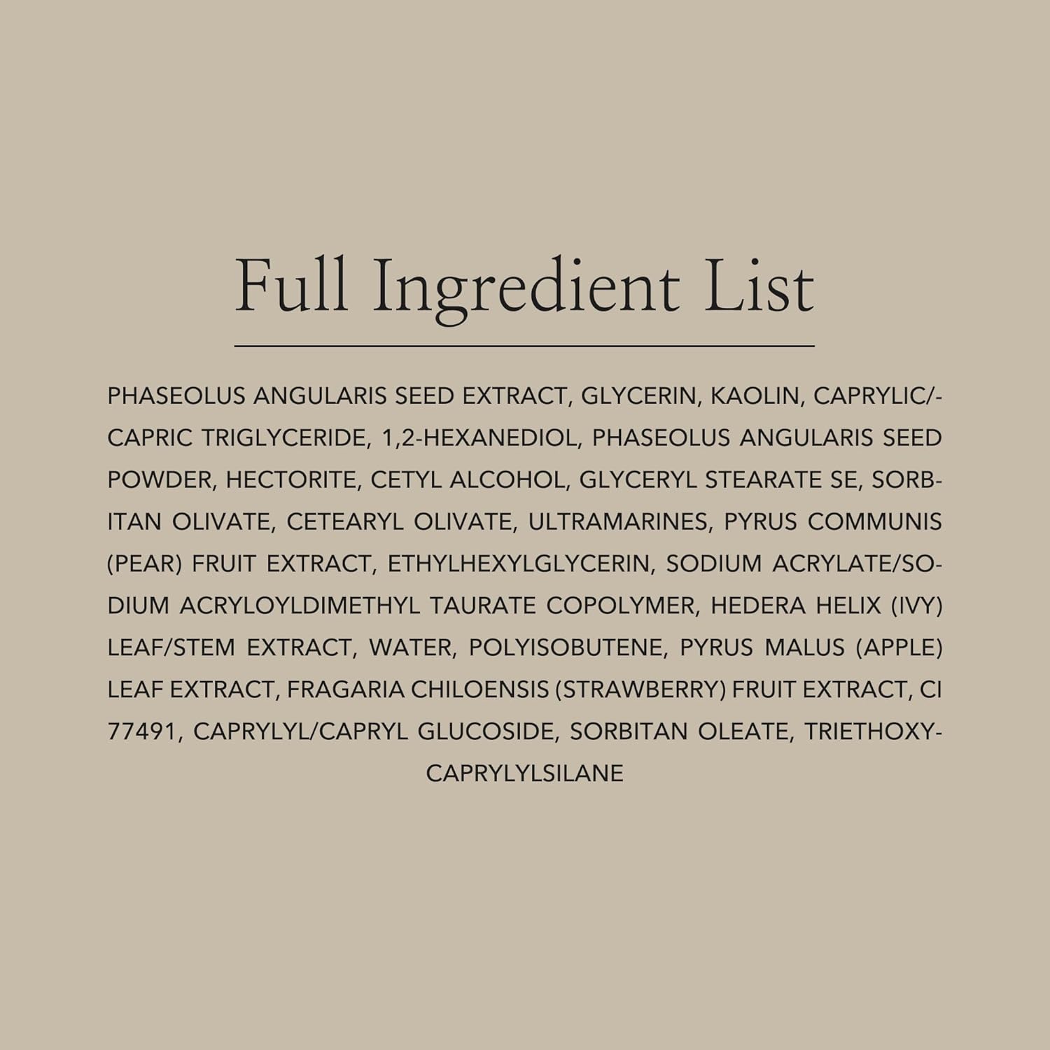 - Kaolin Kaolin absorbs sebum, and red bean extract and red bean powder help with exfoliating and clear skin texture.
