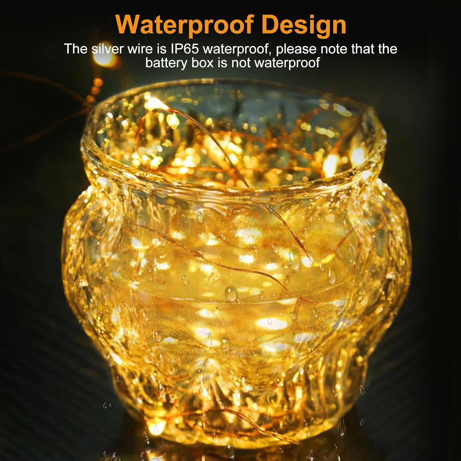 - IP65 Waterproof and Safe to Use: Light string supports IP65 waterproof, can be submersible in water (Battery box is not waterproof). Powered by a safe 1.5V low voltage, and will not heat or short-circuit even after a long use, safe of touch and use