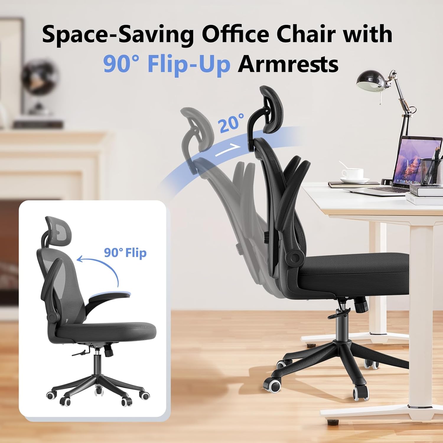 - Space-Saving Flip-Up Armrests (Maximize Workspace): Flip armrests 90° upward to stow completely under desks! This mesh office chair transforms into compact mode, freeing 35% more floor space around your computer station.