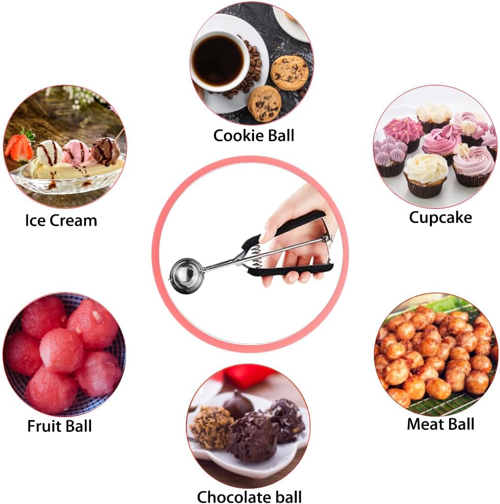 - HIGH QUALITY AND SAFETY - The cookie scoops for baking are made of 18/8 stainless steel, sturdy and durable. With thick rubber handle, non-slip, easy to grasp. Food grade stainless steel can ensure safety and reliability, and these dishers scoops are not easy to rust, corrosion or broken.