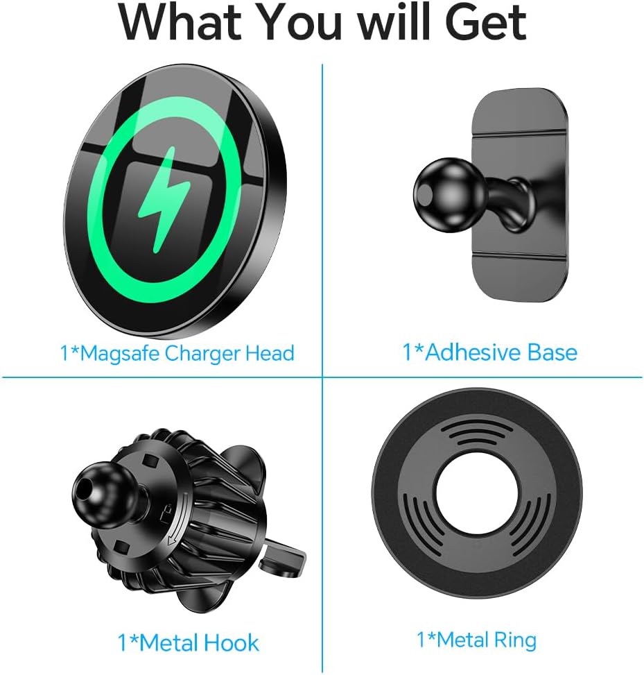 - 2 IN 1 Car Phone Holder Charger- As the leader of adhesive MagSafe car mounts; The ultra-durable adhesive base design allows our magnetic car charger for iPhone to adhere securely to the dashboard. It stays stable on bumpy roads or during sudden stops. Never Fall Off-Metal Hook Design: adopts simplified locking design, will catch one of car air vent blades and provide excellent sturdiness. 𝐍𝐨𝐭𝐞: 𝐑𝐨𝐮𝐧𝐝 𝐯𝐞𝐧𝐭𝐬 𝐦𝐚𝐲 𝐧𝐨𝐭 𝐟𝐢𝐭
