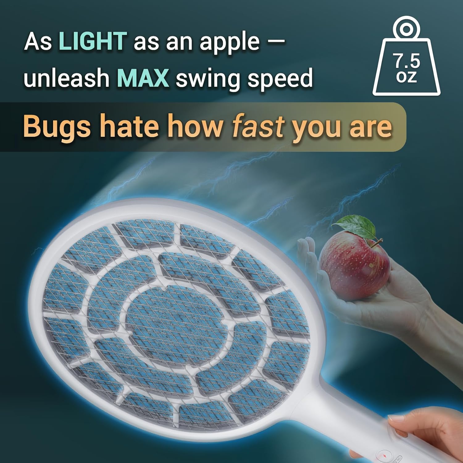 - BUILT FOR THE LONG HAUL – This handheld bug zapper racket doubles as an electric fly swatter racket / fly swatter electric zapper, forged with a 53 % stronger support structure that stays zero warp after 40 000 swings, stays still lethal after 20 000 zaps, and offers 78 % longer power stability for truly long-lasting, enhanced durability.