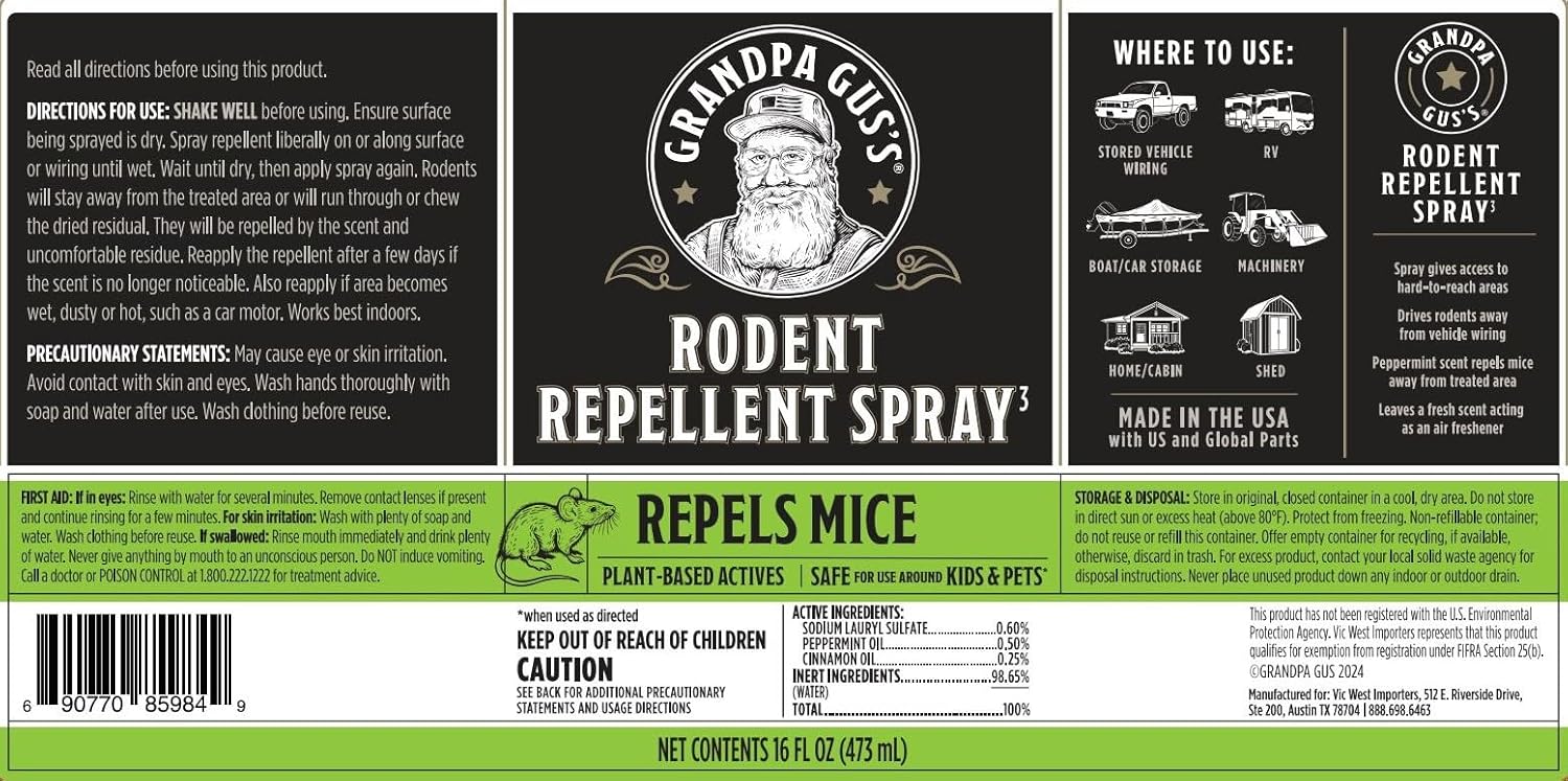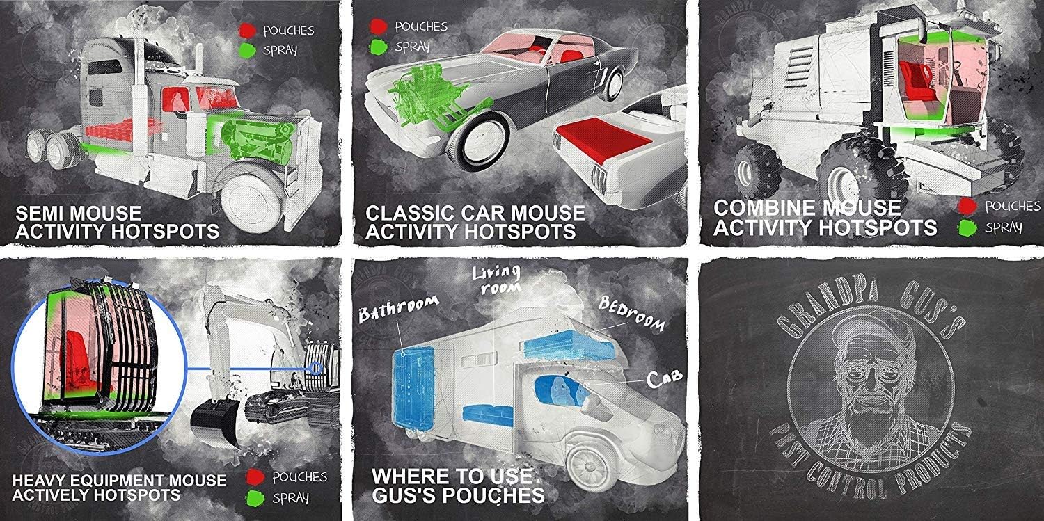 - Deter mouse and rats from chewing on wiring and building nets in your home, shop, RV, machinery, stored vehicles, boat/car storage. The water-based repelling formula spreads faster and leaves no stains. Use it in areas too large or too small for pouches