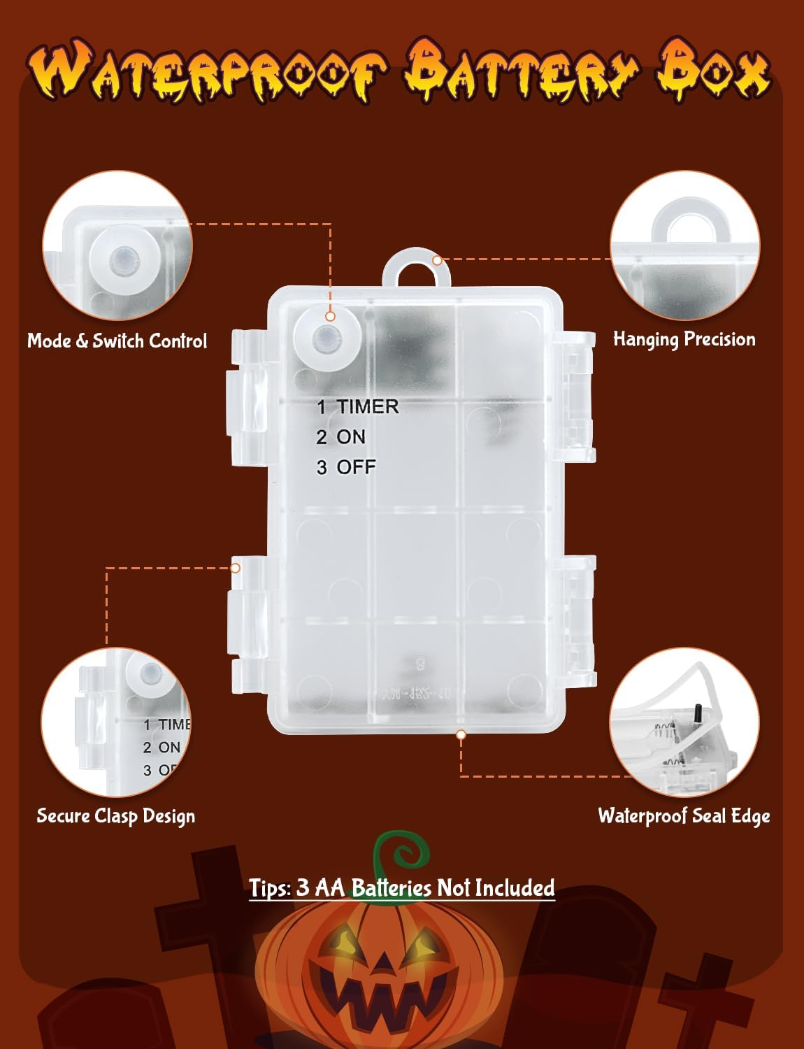 - Convenient Battery Operation No need to worry about finding an outlet with our battery powered Halloween lights. The transparent frosted battery box requires three AA batteries (not included) and features two secure clasps and a waterproof rubber seal. Enjoy the flexibility of placing your Halloween lights anywhere you want, without being limited by power sources.