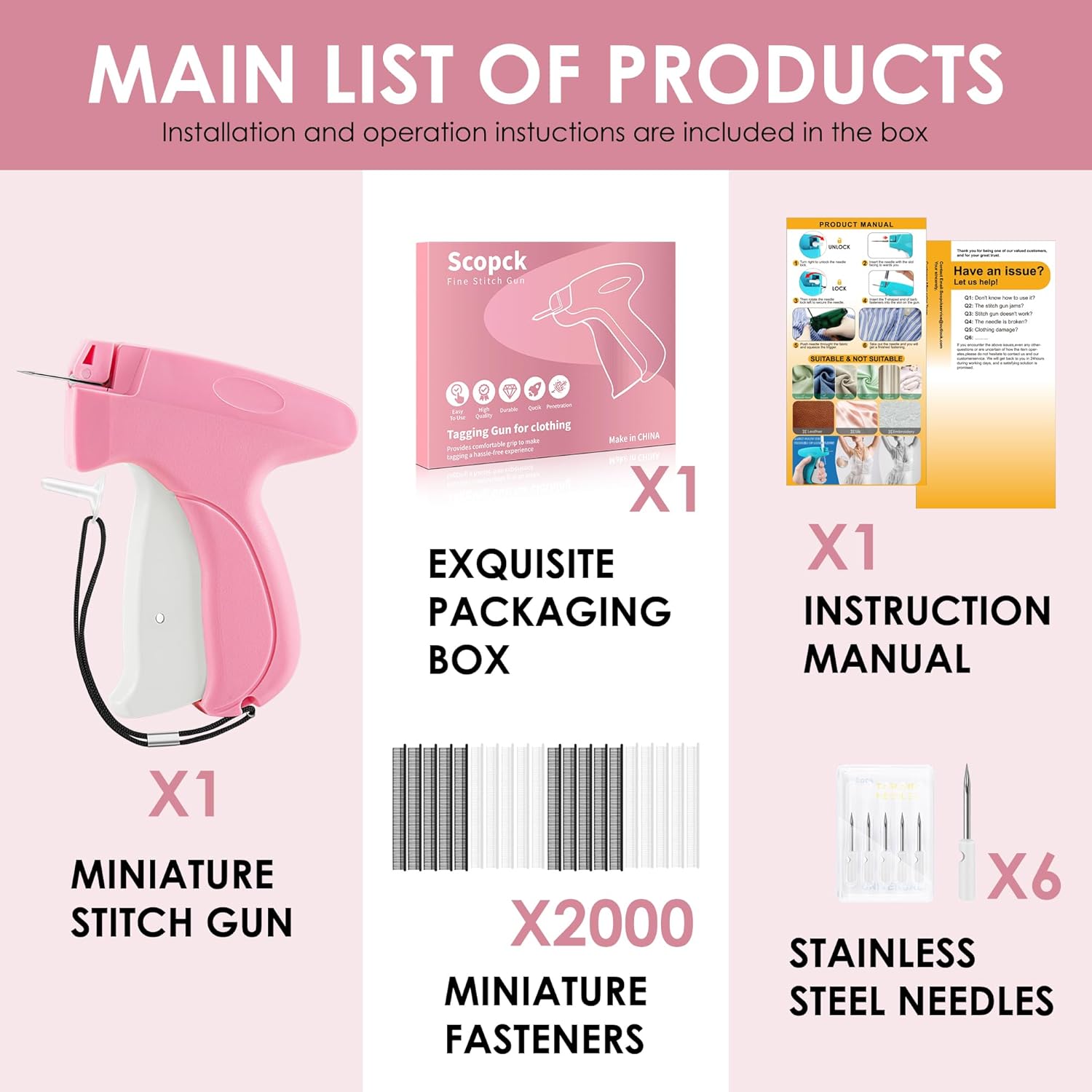 - Package Included: This set includes 1 Instruction Manual, 1 stitch gun with 6 stainless steel pins, 1000 black fasteners, and 1000 white fasteners. The fasteners are 5mm in size, ensuring you won't need to purchase more anytime soon. Please note that the package contains sharp needles and children should use it under adult supervision for safety reasons