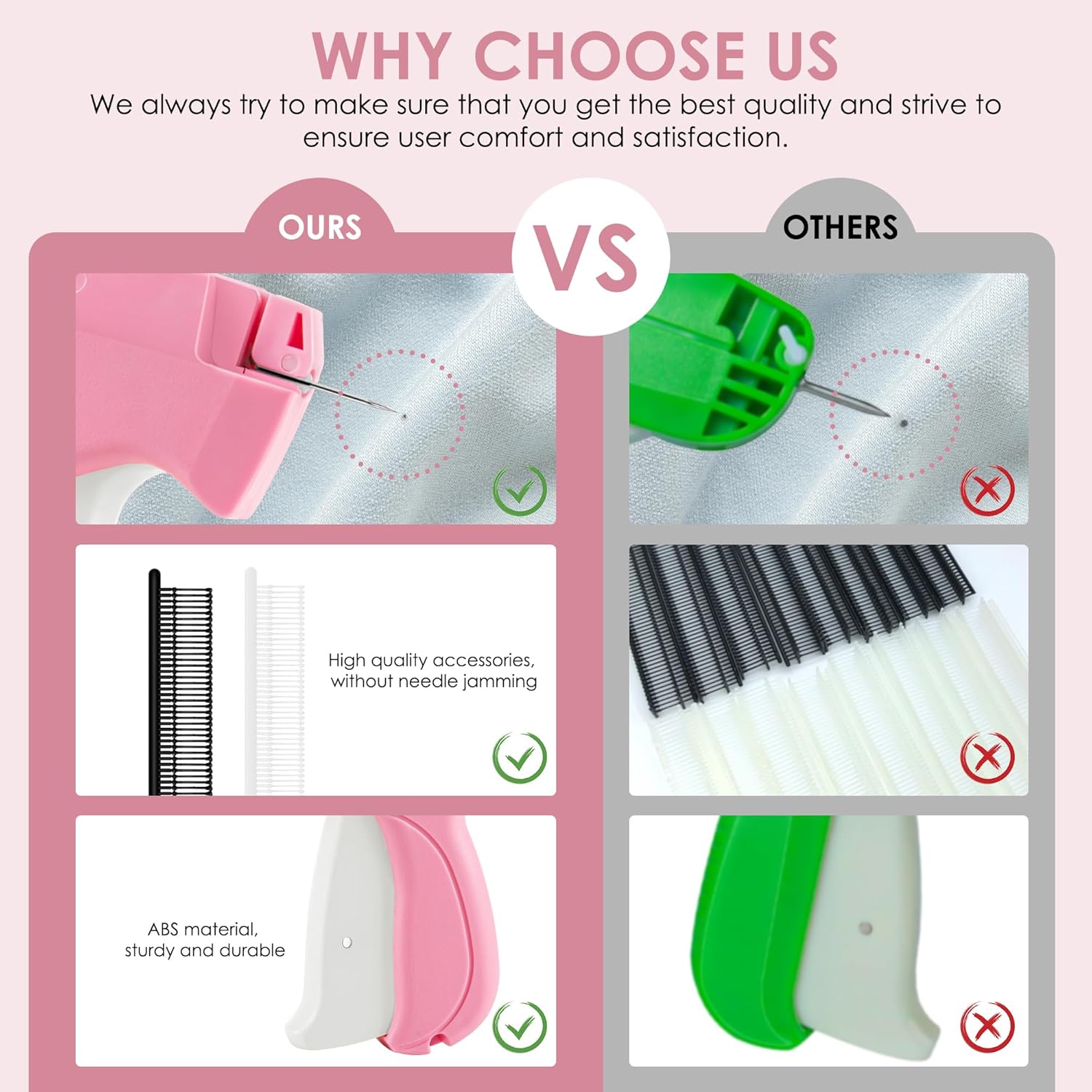 - Premium Material: Made of hard plastic, this stitch gun is small, lightweight, and sturdy. The stainless steel needle is smooth and pointed, easily passing through fabrics. The ergonomic design ensures comfort during long periods of use