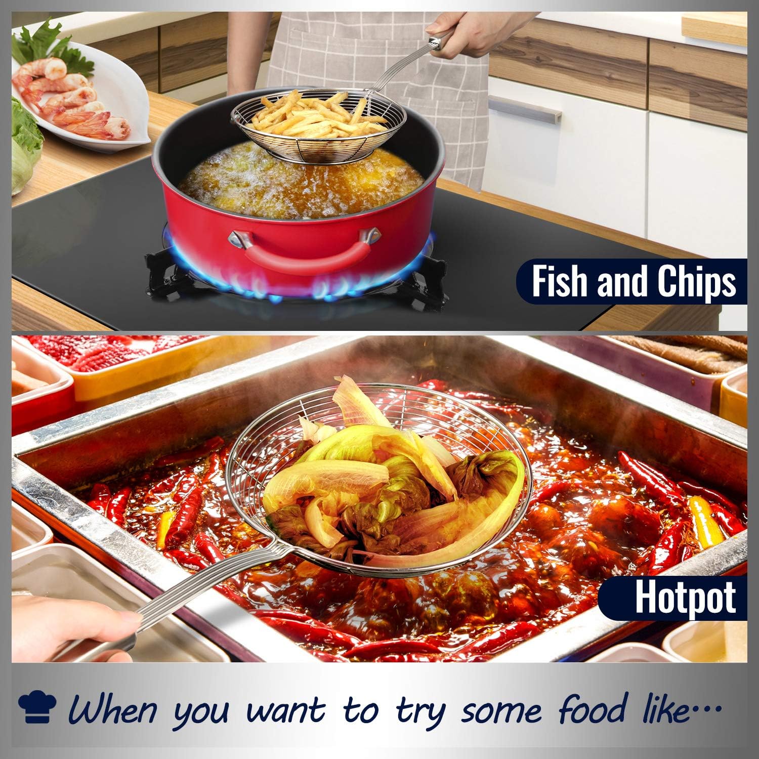 - DOUBLE COIL DESIN: The unique design enhances the bearing capacity of the strainer. It is faster than a fine mesh strainer, retains the temperature but leaving little oil or water, no longer need to endure high temperature, improving efficiency by quick and massive frying and cooking.