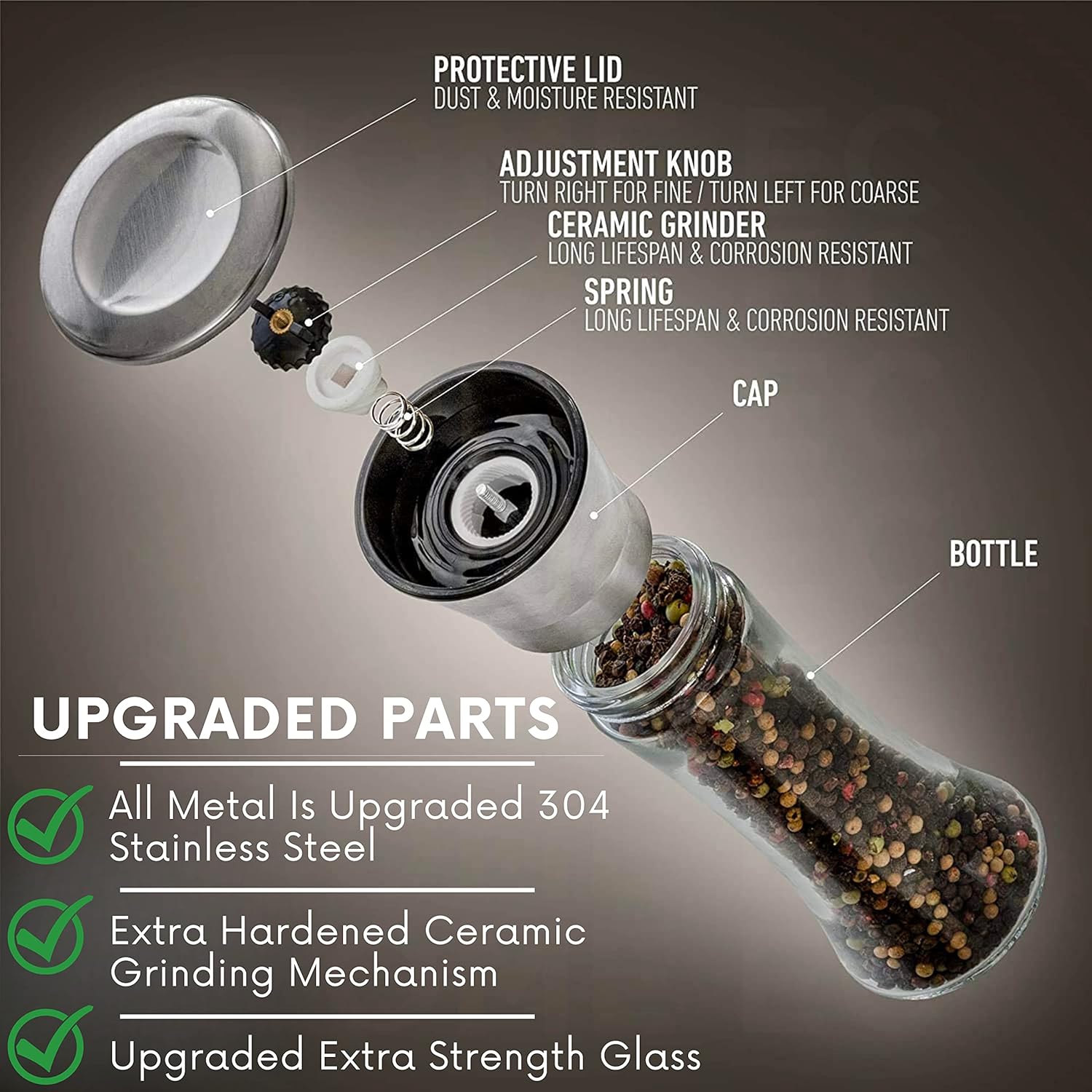- High Quality Glass - Brushed Stainless Steel Salt and Pepper Mill Set : Home EC Salt and Pepper Mills are easy to grip and made of the highest grade non-corrosive, brushed Stainless Steel, and BPA Free glass bottle. This salt grinder and pepper grinder set is a modern, classy and user friendly addition to your kitchen accessories. Perfect for a gourmet meal or dinner party. Great gift or party favor! *Salt and Pepper Not Included.