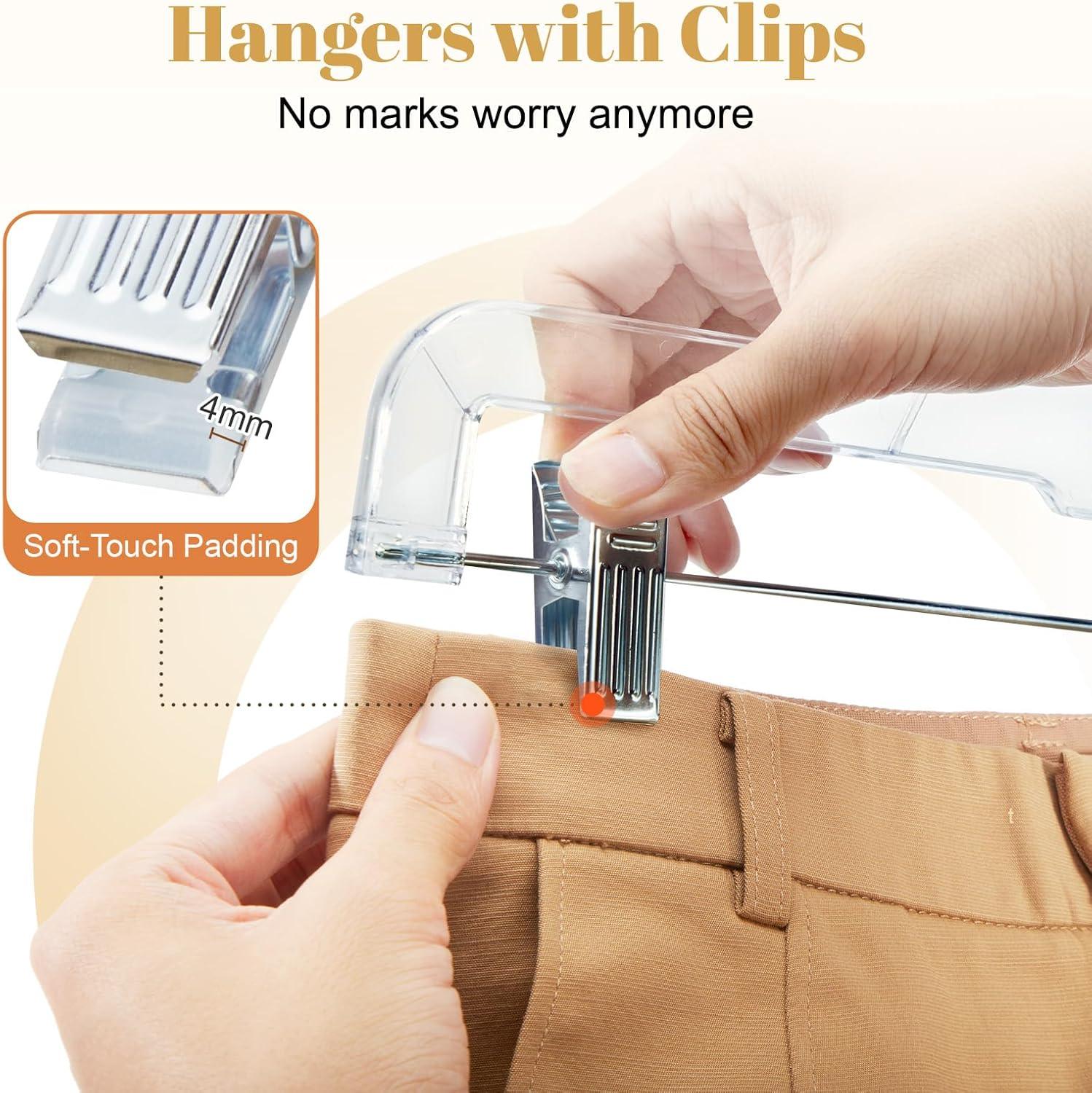 - Hangers with Adjustable Clips - The clear skirt hangers come with metal clips that can be easily adjusted to fit various items such as skirts, pants, shorts, and scarves. The clips are easy to open and close, making it a seamless and smooth organization experience.