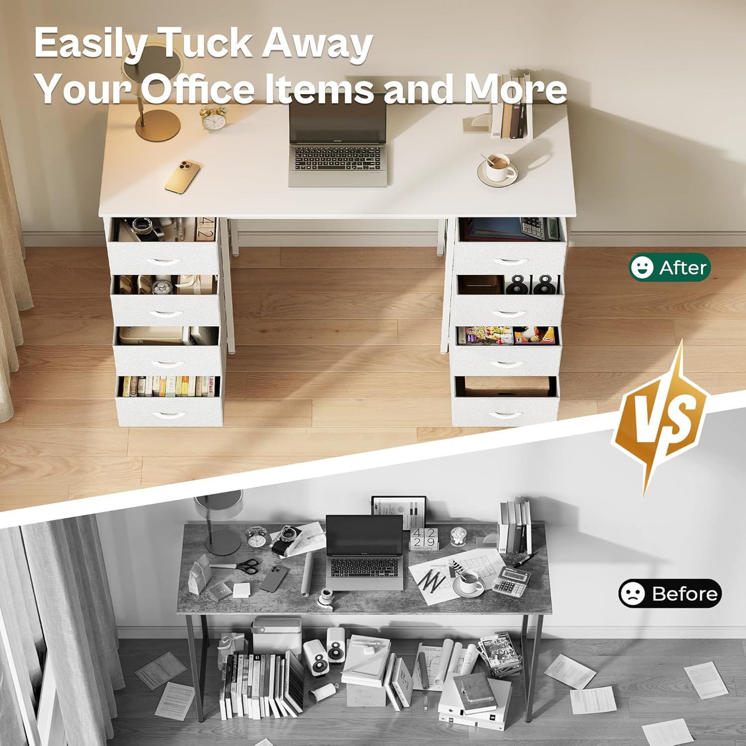 - Vanity Desk with 8 Fabric Drawers Imagine a makeup desk where every beauty product has its place! Our white desk features 8 fabric drawers, giving you plenty of space to store your makeup, skincare, and hair styling tools. Lightweight and easy to pull out, these fabric drawers make organizing your beauty essentials a breeze
