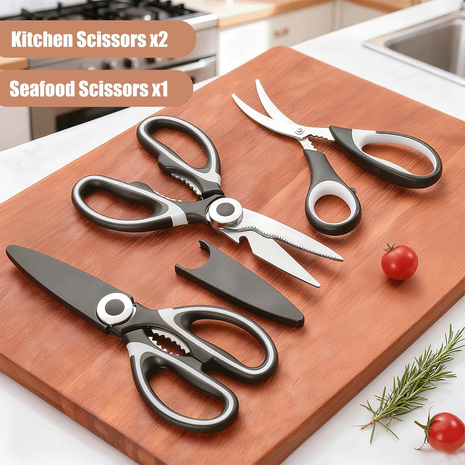 - Durable 2.5mm thickened heavy duty blades: Our kitchen scissors are made with 2.5mm thick stainless-steel blades, which are more durable than regular scissors with 1.5mm thick blades, as 1.5mm blades are more easily damaged when cutting bones. Stainless steel blades prevent rust and corrosion, this ensures that they can withstand frequent use in the kitchen and will last for years to come.