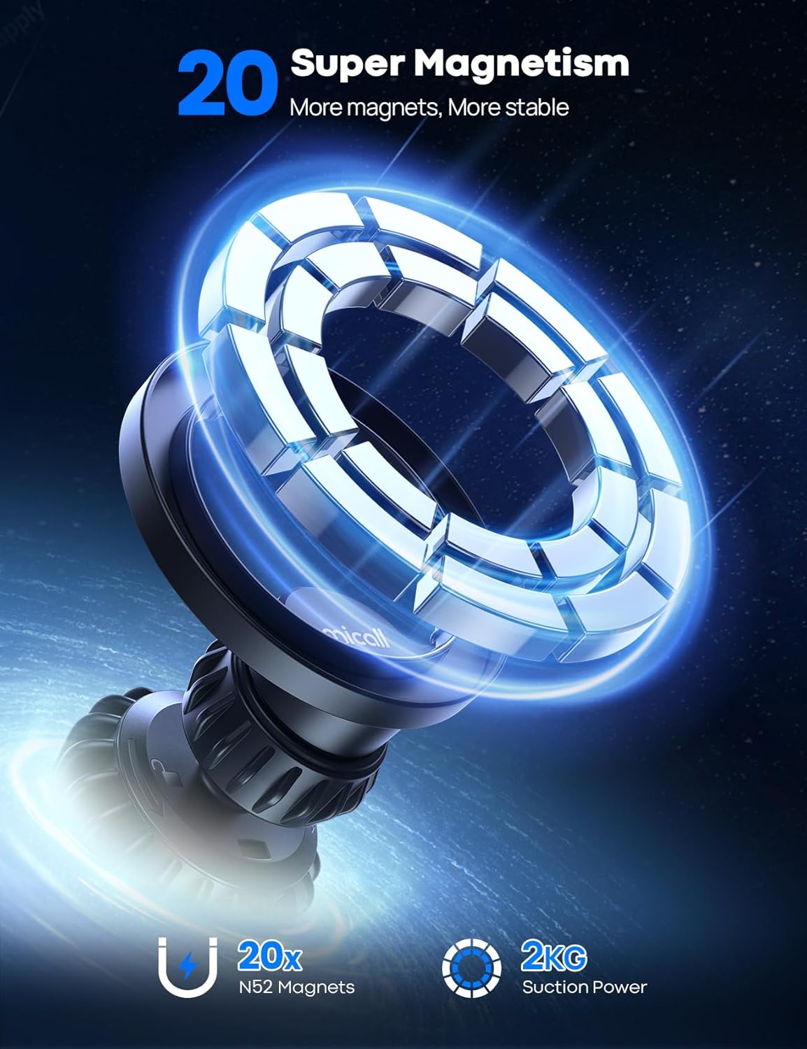 - 20 Upgraded Magnets: 2025 Upgraded Magnet Layout - 38.7% Power Boost! Lami call car mount for Magnate built-in 20 upgraded N52 super magnets, which can easily hold items up to 4.4 lbs. Super powerful magnets ensure a firm hold on your cell phones. Never afraid of falling off even braking strongly, taking sharp turns or driving on rough roads. A practical for MagSafe accessory, car accessory.