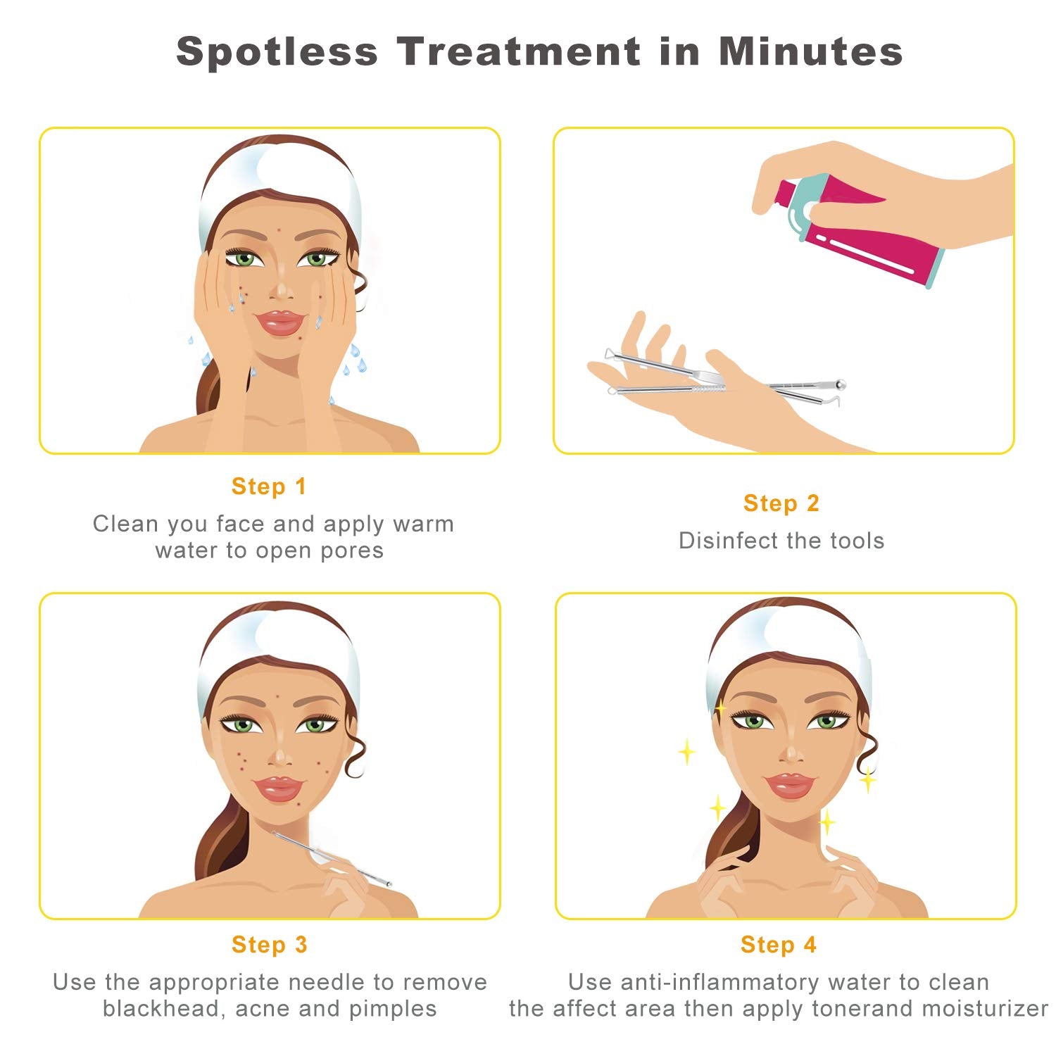 - No scarring: it shall leave less of scars compared to the normal way of using your fingers. you can safely remove the annoying pimples by following the follow instruction: (please choose the MATURED acne pore, otherwise it will get worse) firstly hold the warm cloth to the area to open up the pores, then use alcohol to wipe your pore area and the tools before/during and after, lastly apply toner to your skin.