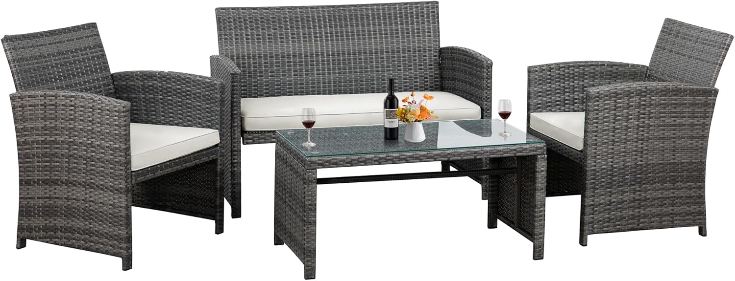 - Exquisite Tempered Glass Table Our outdoor four-piece set comes with a coffee table with a tempered glass top to create a smooth, sturdy surface for food and drinks; don’t worry about overturning liquids, as the glass tabletop can be restored with a simple wipe. All while adding a touch of elegance to your outdoor space.
