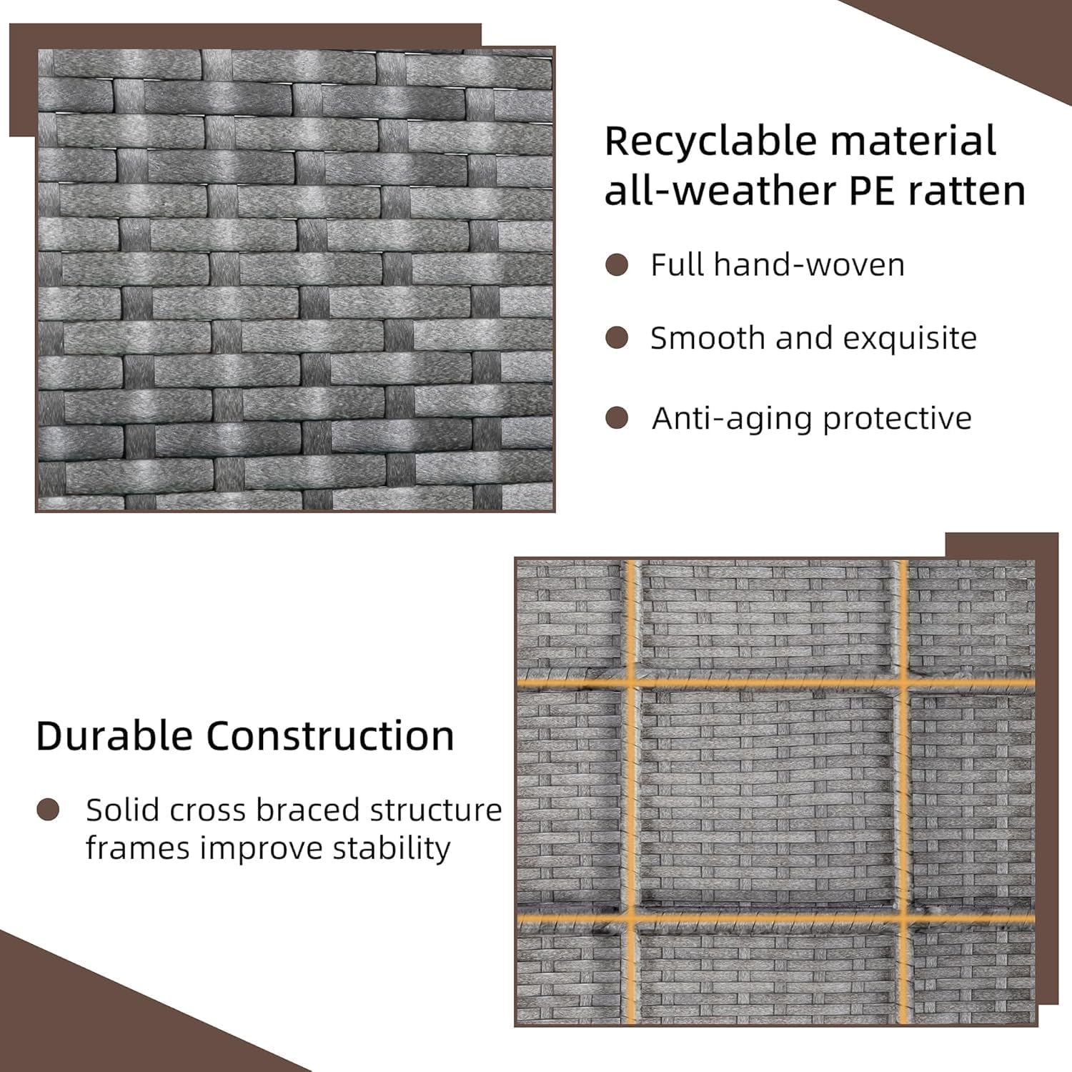 - PE Rattan & Solid Structure Patio furniture made of high-quality and durable Steel Frame and hand-woven Rattan, Built to last, resistant to deformation, large load capacity. Hand-woven rattan provides both elegance and adaptability to all weather conditions.