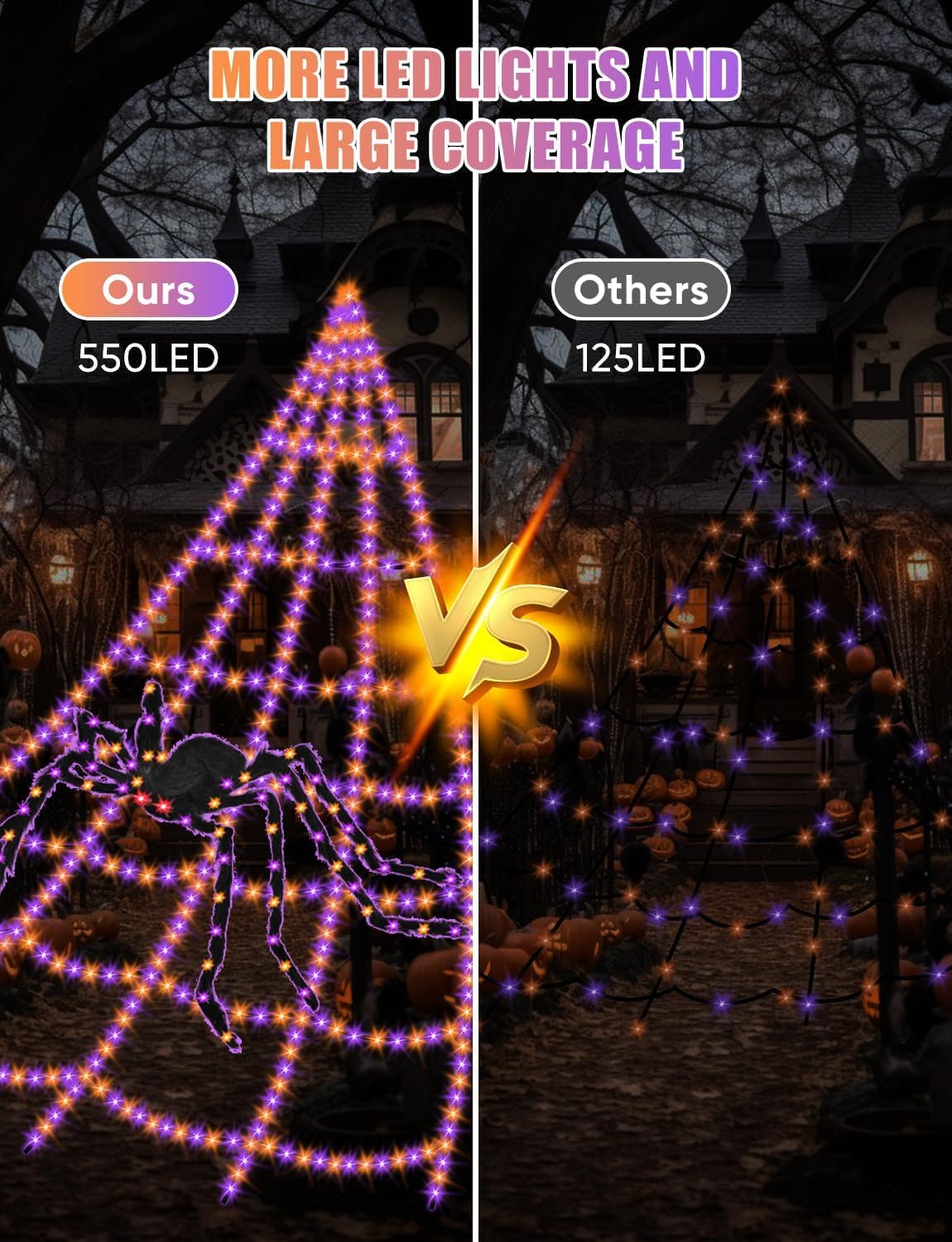 - Ultra-Bright 550 LED Bulbs, Shining in All Directions: Featuring an innovative design with 550 LED bulbs, these lights illuminate evenly in both horizontal and vertical directions, creating a breathtaking light show that enhances any Halloween party atmosphere and becomes the star of the night. Giant Spider Webs Halloween Decorations,Spider Webs Halloween Decorations Lights