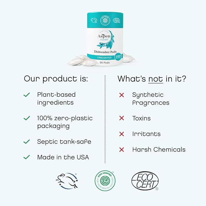- Zero plastic: Our unscented natural dishwasher pods are made of biodegradable, plant-based ingredients that leave your dishes sparkling clean every time. hey, are packaged in a 100% recycled paper container with NO plastic, while being fully compostable.