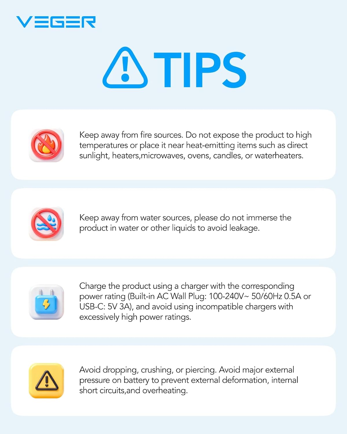 - What You will Get: A VEGER 10000mAh portable charger with built in cables, 1x user manual, our worry-free 12-month guarantee and 7 Day/24H friendly customer service. If you have any problems, please contact us and we will solve it within 12 hours.