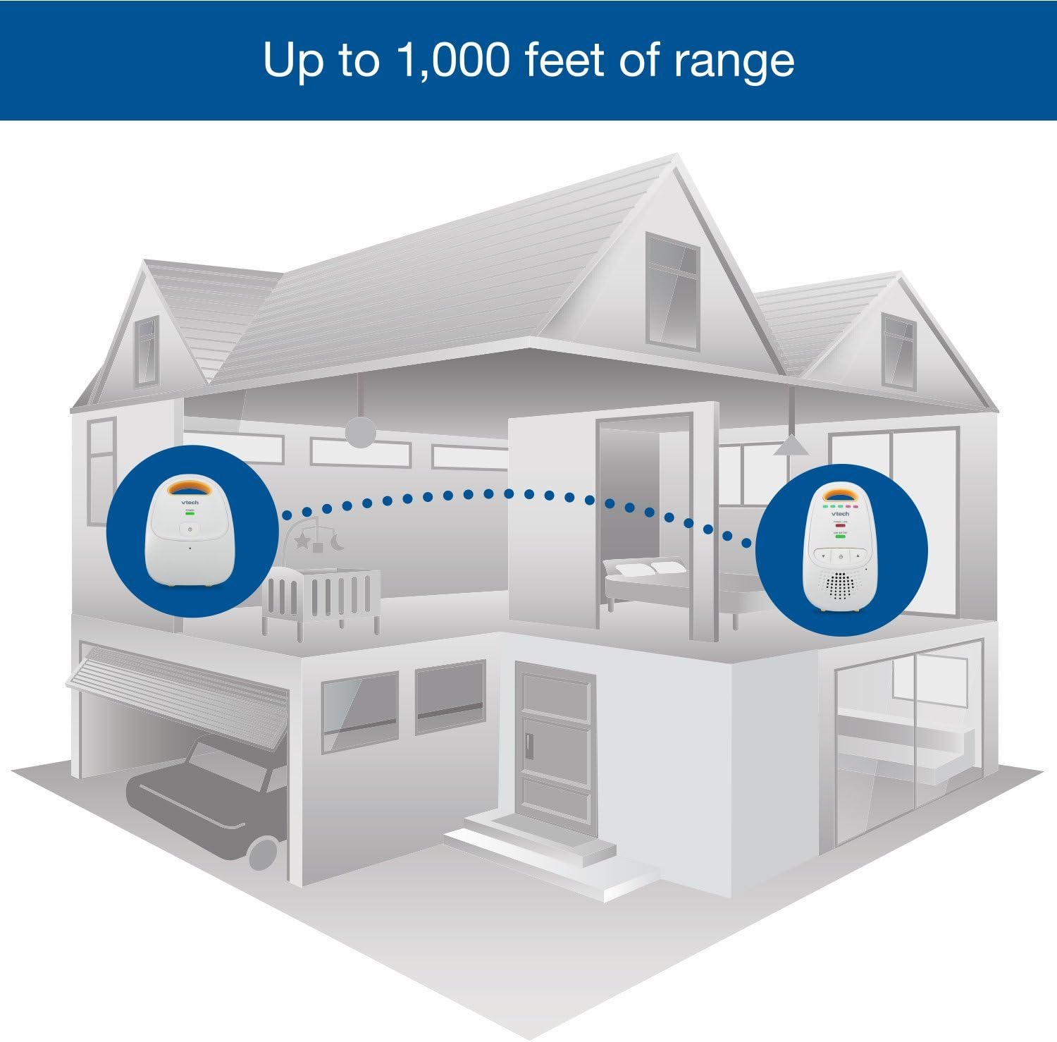 - Best-in-class Long Range The VTech DM111 Audio Baby Monitor's dependable long operation range covers up to 1,000 feet, lets you go about your day and stays connected with your baby from another room or even from the yard