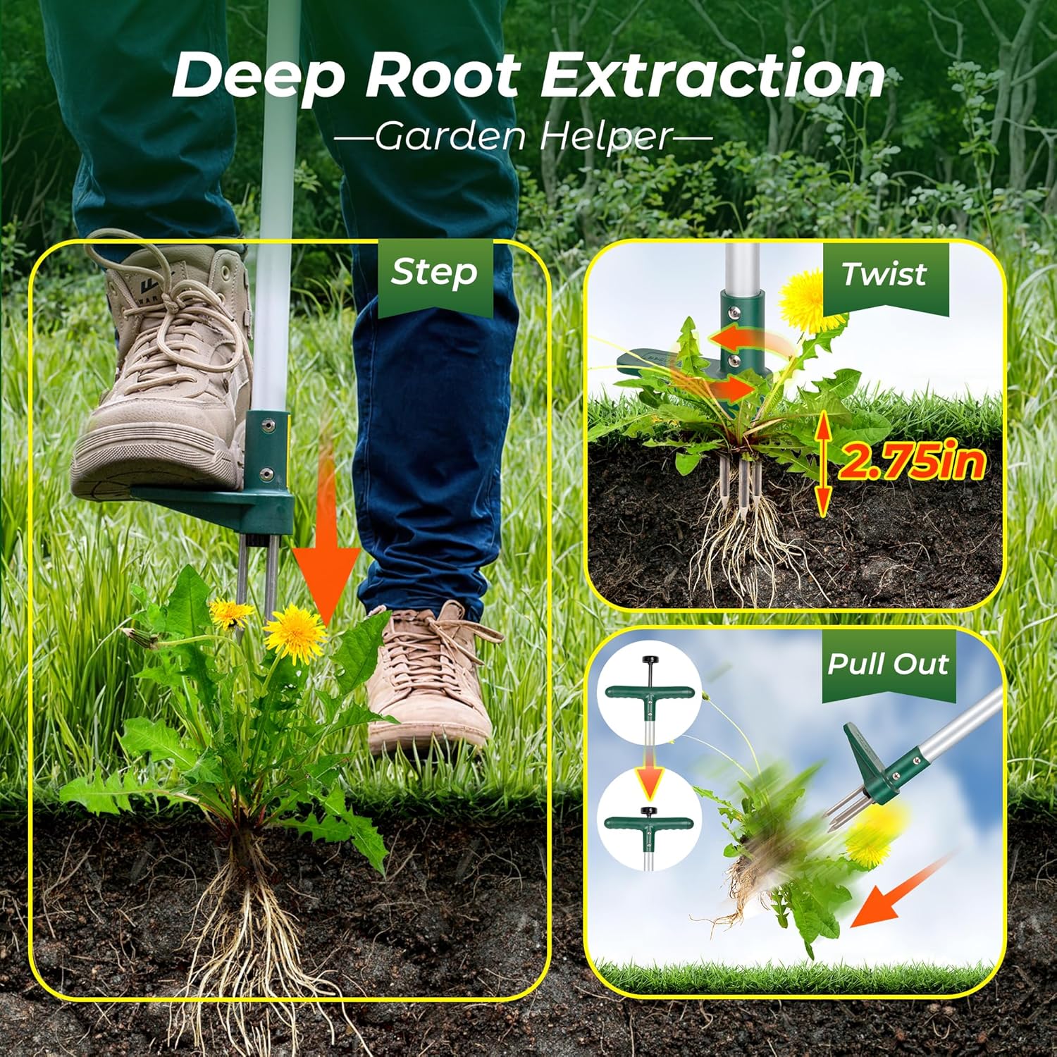 - Standup Weeding Tool for a Better Gardening Experience: Get rid of weeds with this long-handled lawn weeding tool. The 39” tall handle lets you uproot the weeds without having to bend over or go down to your knees. The foot pedal lets you put enough force on the gardening weed extractor to penetrate the ground and grab the whole weed, including the roots, so it doesn’t grow back. It is good tools for your garden, backyard, front yard landscaping