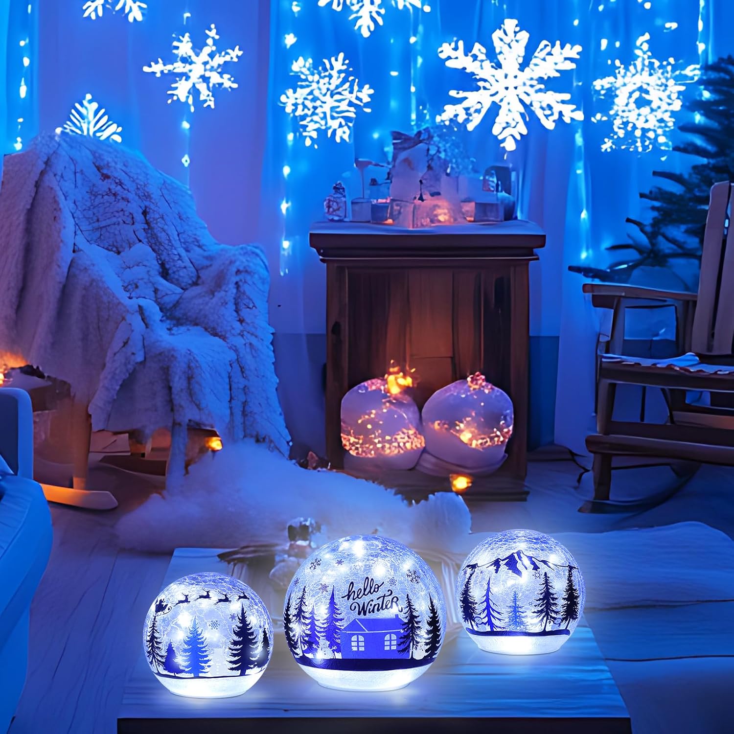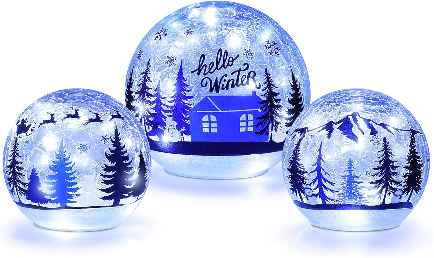 - WINTER WONDERLAND DECOR SET Bring home the magic of winter with our set of 3 illuminated glass spheres, each showcasing a charming winter scene. The "Hello Winter" inscription, along with the silhouettes of snow-covered trees, cozy houses, and playful reindeer, creates a festive atmosphere that is perfect for the holiday season. These decorative spheres will add a touch of whimsy and warmth to your Christmas decor.